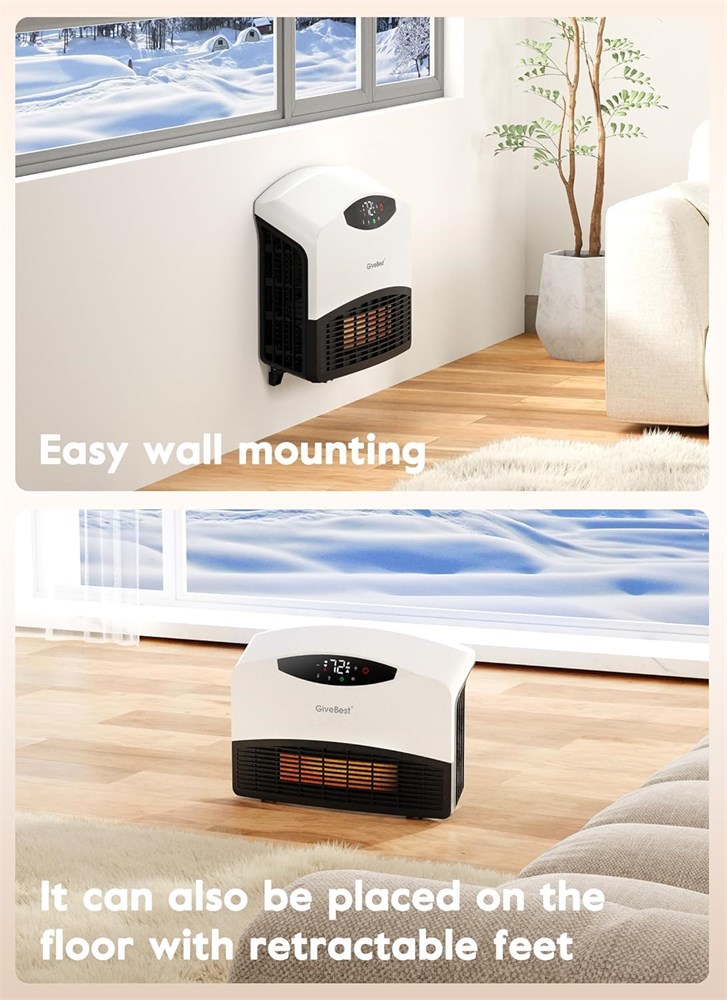 REMOTE, WIFI AND TOUCH CONTROL Remote Control: The wall mounted heater comes with a remote control, allows you to adjust its settings from a distance. WiFi Control: The wall mount heaters with WiFi control let you to turn on the heater in advance to preheat when you are downstairs. Touch Control: The electric wall heater features an intuitive touch control panel, displays the current temperature and other relevant information for easy monitoring FLOOR OR WALL MOUNTED For wall-mounted use, you can securely mount it on the wall. This option is perfect for areas with limited floor space. It can also be placed on the floor with retractable feet and a carry handle. This placement offers easy portability and allows you to move the heater between different rooms or areas based on your heating needs. This wall heaters is ideal for living room, bedroom, bathroom, garage, basement and other indoor use scene EFFICIENT ECO HEATING Equipped with a precise thermostat, the ECO mode allows you to set and maintain your desired room temperature. Once the room reaches the set temperature, the wall mounted space heater will automatically adjust its heating output to conserve energy MULTI SAFETY PROTECTION Heat up your day and night without worries. ETL-listed system provides tip-over and overheat protection. Along with V-0 flame-retardant materials to ensure ultimate safety in all aspects. Overheat protection ensures that the heater does not pose a fire hazard. Tip-over protection are critical safety features in space heaters, especially in homes with children, pets 1500 WATTS OF POWER AND 5200 BTU As a primary heat source: (Up to 200 sq.ft of zone heating (in a well heat insulated room).