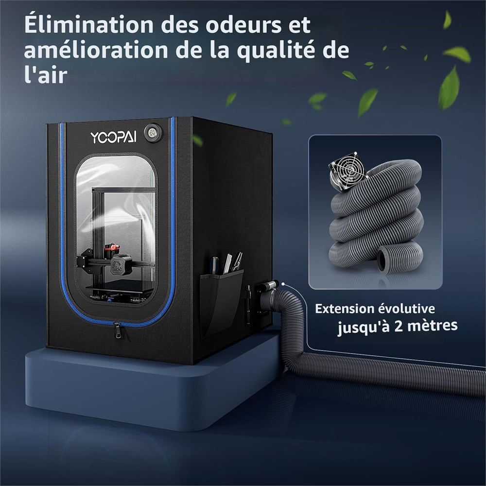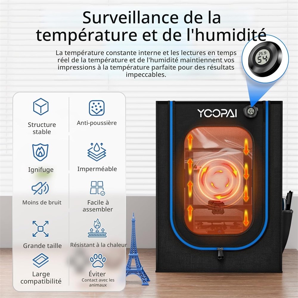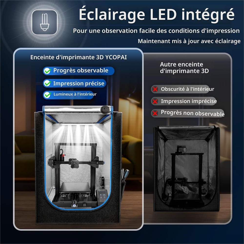clairage am lior pour votre zone d'impression : am liorez la visibilit de votre espace de travail avec notre bande lumineuse LED int gr e innovante. Il illuminera votre processus d'impression, vous permettant de le surveiller plus efficacement. En identifiant rapidement les probl mes potentiels tels que les bourrages de filament, les probl mes d'adh rence des couches ou les d salignements, vous pouvez les r soudre rapidement m me dans des conditions de faible luminosit . Surveillance de la temp rature et de l'humidit , isolation du bruit Notre bo tier est quip d'un syst me de surveillance avanc qui fournit des lectures en temps r el de la temp rature et de l'humidit . Cela vous aide optimiser les conditions d'impression et obtenir des impressions de meilleure qualit . Un couvercle de imprimante 3D ferm sur les six c t s bloque efficacement la transmission du bruit d'impression, r duit efficacement le bruit et permet de profiter d'un processus d'impression silencieux. Am liorez la qualit d'impression avec une temp rature constante Offre un environnement stable et contr l pour vos impressions, le maintien d'une temp rature constante pendant l'impression garantit la production d'impressions de haute qualit tout en vitant les d faillances d'impression et le gaspillage de mat riaux. Une temp rature constante r duit le risque de colmatage et de blocage du mat riau, am liorant la vitesse et l'efficacit de votre impression. R sistant la poussi re et au feu, s r utiliser : prot gez votre imprimante 3D et r duisez le risque d'accidents avec des mat riaux r sistants au feu et une structure robuste. vitez que les particules de poussi re p n trent et n'impactent n gativement la qualit d'impression, assurant des r sultats stables et parfaits chaque fois. Prot ge efficacement contre les contacts accidentels des enfants ou des animaux de compagnie. Installation rapide et utilisation long terme Installation facile en 5 minutes, d marrage rapide et d montage facile pour le d placement ou le remplacement. Sa construction robuste assure la stabilit pendant le fonctionnement, minimisant les vibrations qui pourraient compromettre la pr cision d'impression, et peut supporter une utilisation long terme et n'est pas un produit jetable. Large compatibilit La taille d'imprimante prise en charge (y compris la hauteur du support de bobine) est inf rieure 74,9 65,0 54,9 cm. Veuillez mesurer la hauteur de votre imprimante avant de commander. Compatible avec les imprimantes 3D Creality Ender 3V2/3V2 Neo/Ender 3S1/3S1 Pro/Ender 3Pro/Ender 3/3Neo/Ender 3Max/Neo/Ender 6SE/Ender 5/5Pro/5S1, Anycubic Kobra/Anycubic Mega Pro/ELEGOO Naptune.