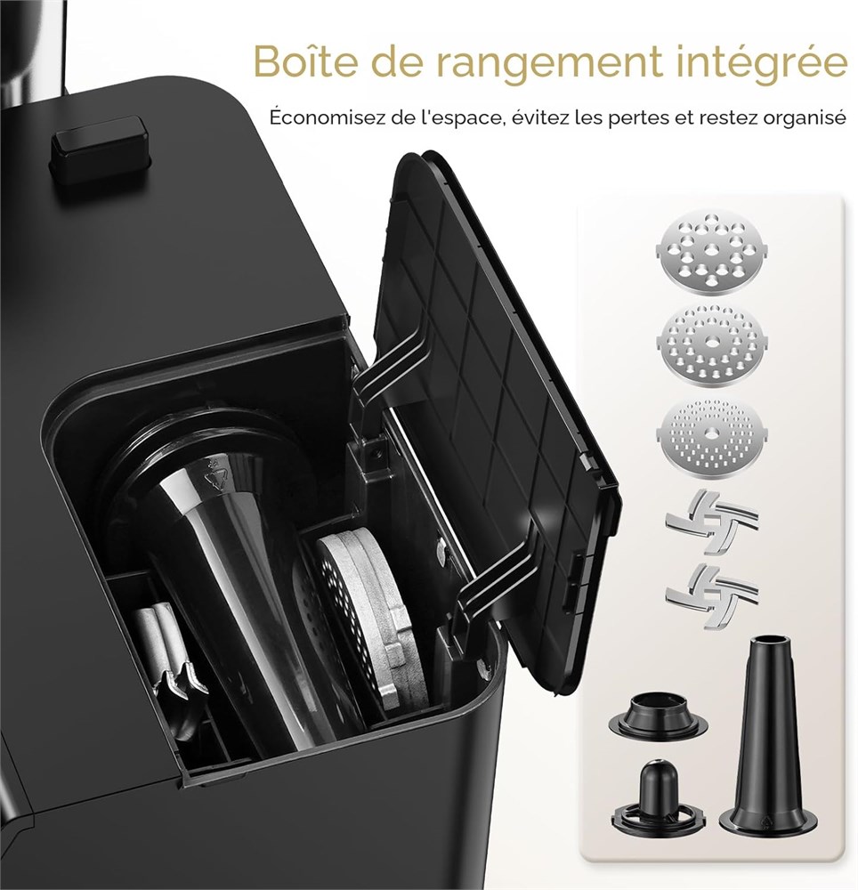 cran couleur tactile intelligent et 3 programmes de vitesse : notre cran couleur tactile intelligent offre un fonctionnement intuitif et des visuels nets. Avec des programmes 3 vitesses (viande, saucisse, revers), il est parfait pour cr er des hamburgers, des saucisses ou des recettes personnalis es - composez sans effort des textures grossi res fines. Mode viande : broyage haute vitesse pour les viandes et les l gumes. Mode saucisse : traitement doux basse vitesse pour des garnitures d licates. Mode inverse : inversion en un seul robinet pour effacer les confitures instantan ment. Technologie de broyage non obstru e : notre hachoir viande s'applique une technologie anti-encrassement avec l'inversion automatique am lior e d tecte la r sistance et s'inverse instantan ment pour liminer les blocages, r duit la fr quence de nettoyage manuel et le d montage difficile. La protection contre la surchauffe emp che l' puisement du moteur et r duit l'usure de la lame/moteur de 40 % par rapport aux broyeurs standard. Conseil : ne pas mettre de viande avec la peau ou la graisse, cela cessera de fonctionner Technique de broyage de viande max 3000 W : am liorez votre cuisine avec notre hachoir viande. Avec une puissance de verrouillage maximale de 3000 W, il broie jusqu' 1,8 kg/min. Parfait pour les cuisiniers domicile qui ont besoin de traiter de grandes quantit s rapidement. Le syst me de moteur am lior 2025 assure un broyage fluide et efficace. Remarque : vitez une utilisation continue pendant plus de 10 minutes pour viter la surchauffe. Rangement int gr et accessoires enti rement fonctionnels : notre hachoir viande lectrique est livr avec un rangement int gr pour garder tous les accessoires organis s, y compris 2 lames, 3 plaques de broyage, et un accessoire pour saucisse et kibbe. Fini les cuisines d sordonn es : tout ce dont vous avez besoin est soigneusement rang en un seul endroit. Nettoyage et assemblage faciles : notre hachoir viande lectrique simplifie votre routine avec des pi ces d gagement rapide et un assemblage facile. Les lames et les assiettes en acier inoxydable passent au lave-vaisselle. Con u pour votre commodit , ce hachoir viande lectrique offre une exp rience sans tracas du d but la fin.