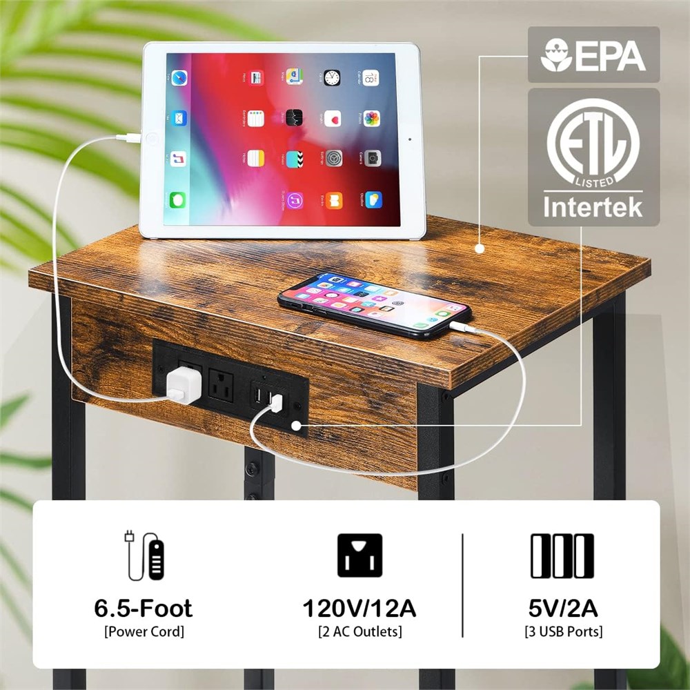 Table d'appoint avec station de charge : dimensions du produit : 39,9 x 30 x 53,8 cm (L x l x H). La station de charge comprend deux prises CA 3 broches et deux ports USB, qui peuvent facilement charger votre t l phone, tablette, etc. La longue alimentation peut vous permettre de d placer cette table d'appoint facilement. Table de chevet 2 niveaux : l' tag re ouverte sup rieure et inf rieure vous offre assez d'espace de rangement pour le salon ou la chambre. Ce n'est pas seulement une table de chevet rechargeable, mais peut galement tre utilis e comme table d'appoint, table de t l phone, etc. Id al pour le salon, la chambre coucher, le dortoir, le bureau et les petits espaces. placer c t du lit, c t du fauteuil inclinable ou dans le couloir. Cadre en m tal durable et stable : la table d'appoint avec tag res de rangement en panneaux de particules et cadre en m tal stable. 4 pieds r glables tout en ajustant la hauteur de la table lat rale sur les surfaces in gales et en am liorant la stabilit . Assemblage facile et rapide : en suivant les instructions de montage et en utilisant les outils fournis, l'assemblage se fait sans effort en 10 minutes. Service satisfaisant : en cas de probl me, n'h sitez pas nous contacter directement, nous vous r pondrons dans les 24 heures. C'est une petite table d'unit qui s'adapte parfaitement votre petite zone pr vue. Elle peut donc tre un peu plus petite que vous ne le pensiez, veuillez confirmer si les donn es de taille r pondent vos besoins avant de commander.