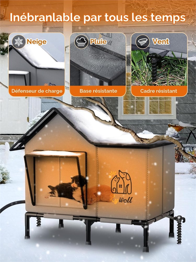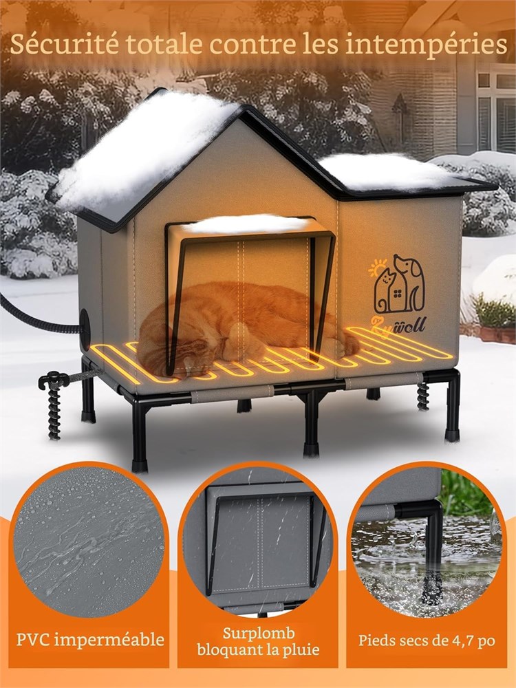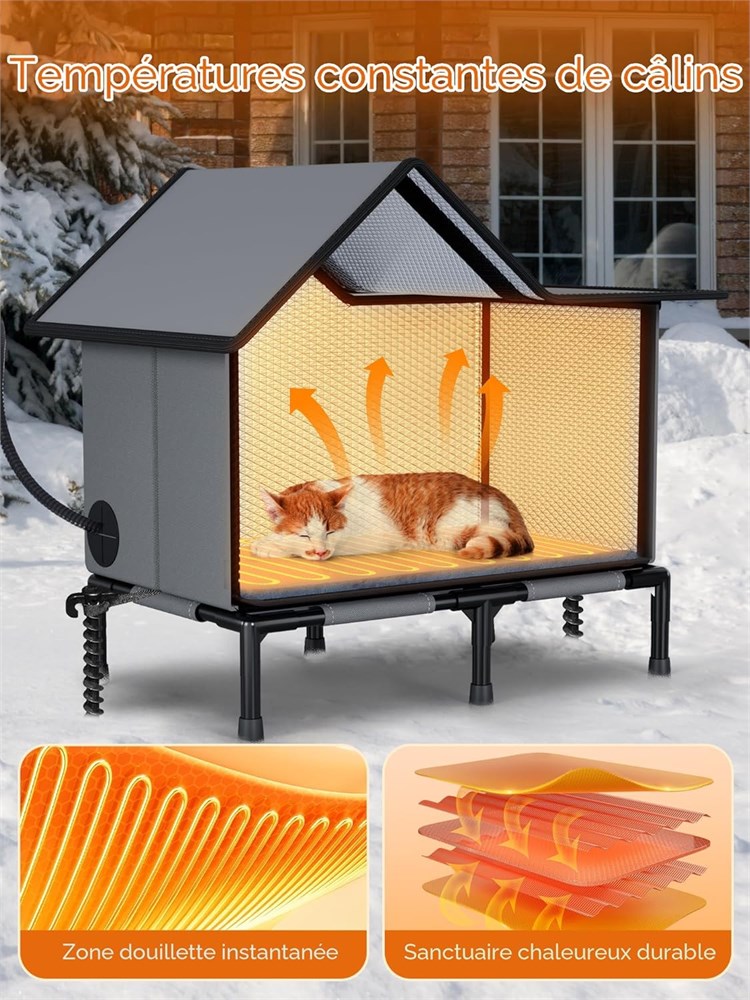 Chauffage et isolation efficaces : la maison chauffante pour chats Rywell est quip e d un coussin chauffant, d un rembourrage en coton perl sur les parois int rieures et d une feuille d aluminium sur les 6 c t s afin de cr er un cycle de chaleur, maximisant l isolation et gardant votre chat au chaud et confortable m me en hiver. La maison chauffante pour chats d ext rieur est con ue en pensant la s curit de votre chat et est dot e d une porte d vacuation. Si votre chat ressent un danger, il peut rapidement et facilement s' chapper. Minuterie et temp rature r glables : la maison chauffante pour chats Rywell d ext rieur offre d sormais 24 h de chaleur en mode automatique, sans r initialisation quotidienne. La fonction minuterie (2/8/12/24 h) permet votre chat de rester au chaud sans consommation d nergie excessive. La temp rature du coussin chauffant varie de 30 55 C, ce qui vous permet de l ajuster selon les pr f rences de votre chat. Qu ils pr f rent se blottir pr s de la source de chaleur ou une temp rature plus douce, le choix leur appartient (et vous). Imperm able et r sistante aux intemp ries : le toit de la maison chauffante pour chats est fabriqu en tissu PVC imperm able, et les c t s sont faits de mat riau Oxford 600D imperm able, assurant que l int rieur reste sec et chaud m me par temps pluvieux ou enneig . L entr e est quip e d un avant-toit afin de bloquer efficacement l eau de pluie. Le cadre de soutien de 12 cm poss de une fonction de protection contre l humidit . Les piquets d ancrage au sol inclus peuvent tre utilis s pour fixer la maison pour chats afin de la prot ger contre les vents forts et les impacts externes. La s curit avant tout, vraiment : le coussin chauffant est certifi UL et dot d une protection contre la surchauffe afin d assurer une utilisation s curitaire pendant le chauffage. Le c ble r sistant aux morsures pr vient les probl mes de s curit caus s par les chats joueurs. La structure tr s durable et les piquets d ancrage au sol inclus r sistent aux conditions m t orologiques extr mes et aux impacts accidentels, assurant la s curit des animaux de compagnie d ext rieur. La priorit absolue de Rywell est d assurer votre chat une treinte 100 % s curitaire et chaleureuse. Bonheur en toute saison : le coussin chauffant est amovible! En hiver, le coussin chauffant int gr procure chaleur et confort votre chat. Pendant les autres saisons, le coussin chauffant peut tre retir et les ouvertures peuvent tre ouvertes afin d assurer une bonne ventilation et une circulation de l air ad quate, permettant votre chat de profiter de son coin douillet pr f r toute l ann e. Un seul achat, une utilisation toute l ann e! L installation est simple : il suffit d ouvrir la structure principale de la maison pour chats, de fixer le toit et d installer le support inf rieur pour commencer l utiliser.