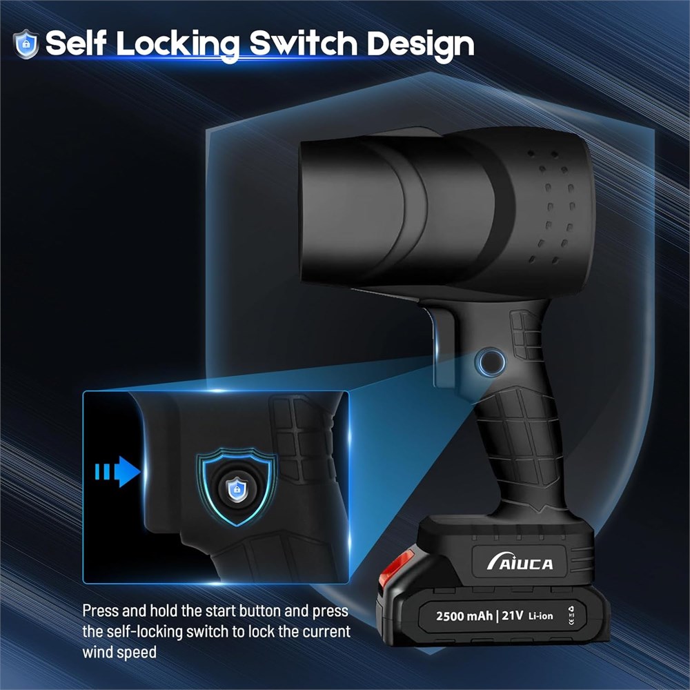 Powerful 250000 RPM Motor Experience professional-grade cleaning with our turbo jet blower ultra-powerful 550W brushless motor, generating hurricane-force 130MPH (200KM/H) winds to blast away stubborn leaves, grass clippings, and debris. The high-speed turbine technology delivers 3X more power than standard blowers, with maximum air pressure up to 1000g, making yard work effortless. 2PCS 2500mAh Batteries This Compressed Air Duster is equipped with 2 powerful 21V-2500mAh lithium batteries with LED battery level indicator. Enjoy up to 30 minutes of continuous run time in high-speed mode, the removable battery is equipped with intelligent protection systems including low-voltage cut-off and over-current protection - when the battery voltage drops too low, the tool automatically shuts off to prevent damage, while the 2.0A fast charging system minimizes downtime. Air Volume Control & Lock Smart trigger-controlled speed adjustment lets you customize power from gentle 80KM/H (for light dusting) to full 200KM/H turbo mode (for wet leaves/debris). Electric Turbo Jet Blower The intuitive pressure-sensitive switch provides precise control for different surfaces and tasks. Lightweight & Ergonomic Design At a mere 1.8 lbs, this handheld mini cordless leaf blower supports no-fatigue operation with a non-slip ergonomic handle for added comfort and convenient one-handed operation, making it easy for the elderly and kids to hold. The lightweight lawn leaf blower is your good helper whether it is lawn care, yard cleaning, computer cleaning, cleaning roof leaves, blowing water, blowing snow or cleaning the garage.