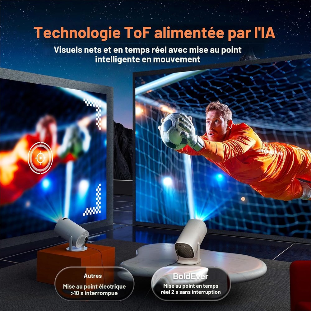 Netflix officiel et WebOS Premium Projecteur intelligent ultime Officiel Netflix Certifi WebOS int gr + t l commande pour un acc s instantan Netflix, YouTube, Prime Video. 1 500 000 vid os provenant d'applications certifi es de confiance. Syst me d'exploitation intelligent avanc : faible d calage, maintenance intelligente, mises jour rapides. Id al pour une utilisation en int rieur, pour cr er de grandes sc nes immersives. Votre hub de divertissement intelligent haut de gamme ! Profitez de vues nettes et vives avec une r solution de 1080p Chaque d tail prend vie, que vous regardiez des animations, des films, du sport ou des pr sentations, offrant un r gal visuel net et vif. Avec une prise en charge de milliards de couleurs, il garantit des images vibrantes, tandis que l am lioration dynamique de la nettet rehausse davantage les d tails pour rendre chaque sc ne plus captivante. La combinaison d'une r solution 1080p, d'une luminosit suffisante et d'une reproduction des couleurs vives garantit une image incroyablement claire et color e, transformant n'importe quel espace en un th tre personnel avec ce projecteur petit mais puissant. Capteur Tof pour une mise au point sans effort : ce mini projecteur dispose d'un capteur Tof avanc Il offre une mise au point automatique rapide et fluide plus besoin de s occuper des r glages manuels. Le syst me de mise au point aliment par Tof garantit que vos visuels restent d'une nettet cristalline et haute d finition, parfait pour des soir es cin ma int rieures confortables, divertir des amis ou r ussir cette pr sentation professionnelle.' De plus, il est tr s facile utiliser, m me si vous tes novice en mati re de projecteurs. Installez-le simplement et plongez dans vos missions ou films pr f r s aucune tape compliqu e, juste du plaisir instantan ! Correction trap zo dale verticale automatique Notre projecteur intelligent est dot d'une technologie avanc e de correction trap zo dale verticale automatique. Peu importe o vous le placez, il ajuste rapidement l'image un carr parfait, vous assurant d'obtenir toujours une image super claire et pr cise. Parfait pour tout rassemblement int rieur - que ce soit sur le mur de votre salon ou pendant une soir e cin ma. Il s'adapte en douceur et optimise la forme de l'image sans effort. Et dites adieu aux ajustements manuels compliqu s Ce projecteur intelligent corrige automatiquement la distorsion trap zo dale verticale. M me s'il n'est pas parfaitement align verticalement, il garantit que l'image soit tout fait correcte. Profitez d'une exp rience de projection totalement sans tracas n'importe o l'int rieur. WiFi 5G : plaisir instantan sur grand cran et BT 5.2 : libert audio totale D couvrez le meilleur des deux mondes avec la mise en miroir WiFi 5G de notre projecteur intelligent et la connectivit bidirectionnelle Bluetooth 5.2. Profitez de la mise en miroir transparente de l' cran (jeux, streaming ou travail) depuis iOS, Android, via le Wi-Fi 5G stable, apportant sans effort du contenu mobile sur grand cran pour une utilisation en int rieur. Bluetooth 5.2 offre un audio polyvalent : utilisez le projecteur comme haut-parleur Bluetooth pour vos appareils ou connectez des haut-parleurs externes pour un son am lior ; l ic ne Bluetooth 5.2 marque cette solution audio flexible et optimis e, am liorant tout am nagement int rieur gr ce ses avantages de double connectivit .