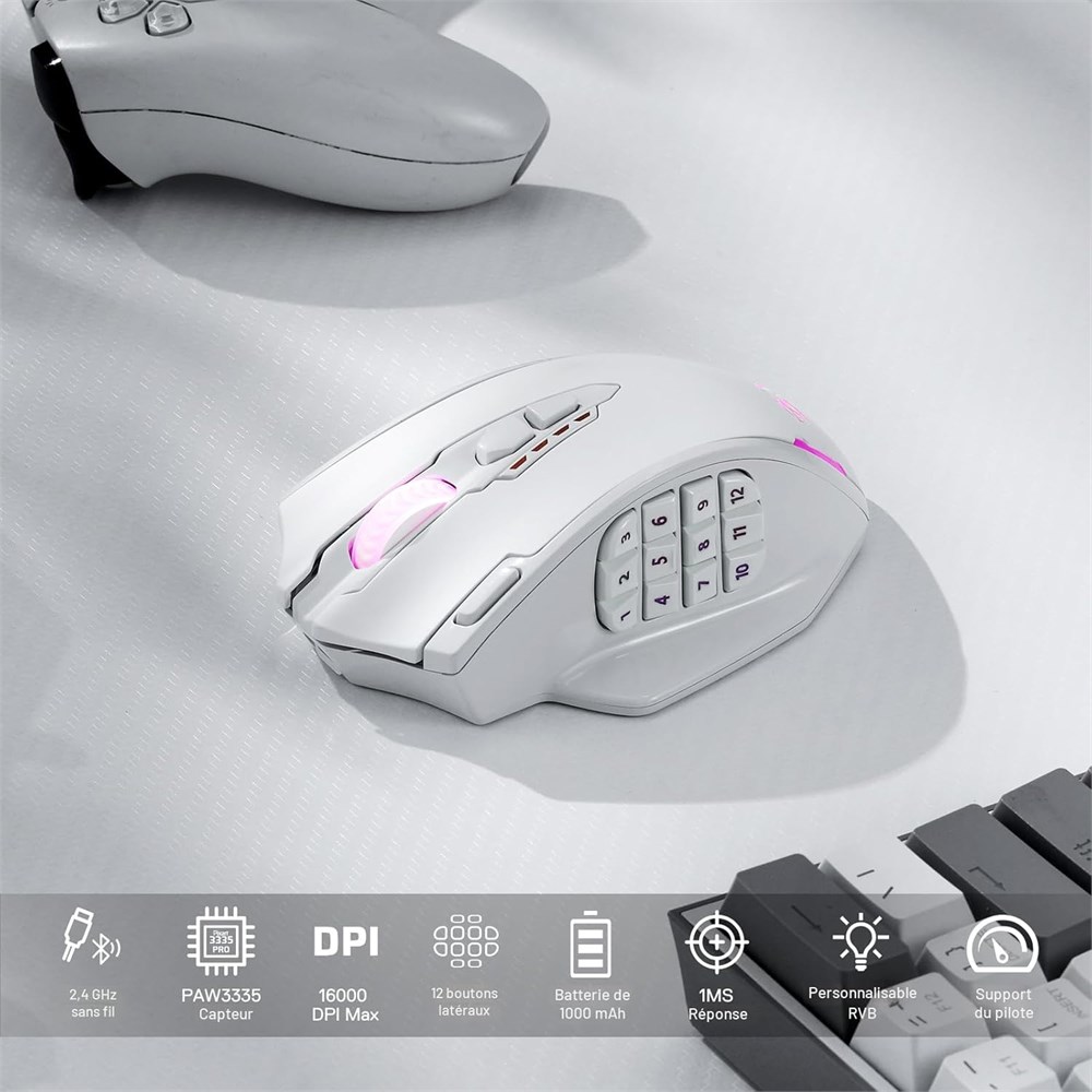 Sans fil/filaire, 2 fa ons d'utiliser : deux modes de mode sans fil 2,4 GHz et USB-C filaire assembl s avec 12 boutons lat raux. Fonction de souris de jeu MMO. Le mode sans fil/filaire et les raccourcis de liaison de touches facilement accessibles maximisent vos d g ts. La Rapidit clair N est Pas Qu un Dire - Avec le capteur de jeu optique Pixart 3335 am lior , le M913 enregistre chaque clic/balayage instantan ment en 1 ms. L'efficacit , la pr cision et la faible latence sont tous inclus dans le contenu de la livraison. Restez allum jour et nuit - Combinaison de puce avanc e faible consommation avec une capacit de batterie durable, garantissant son utilisation pendant de longues heures. Le mode Eco r duit l'utilisation du r tro clairage et augmente la durabilit jusqu' 45 heures. 5 DPI con us pour l'e-sport - quip de 5 niveaux de DPI int gr s (1000/2000/4000/8000/16000) qui vous permettent de passer facilement d'un besoin l'autre. DPI personnalisable 100 pour r pondre vos besoins uniques et raccourcir le temps d'utilisation. Support des pilotes sans compromis - 16 boutons, dont 12 boutons lat raux et des effets d clairage 16,8 millions de couleurs, sont tous personnalisables avec son propre logiciel, m me en mode sans fil. Acc dez la victoire de la mani re exacte que vous souhaitez.