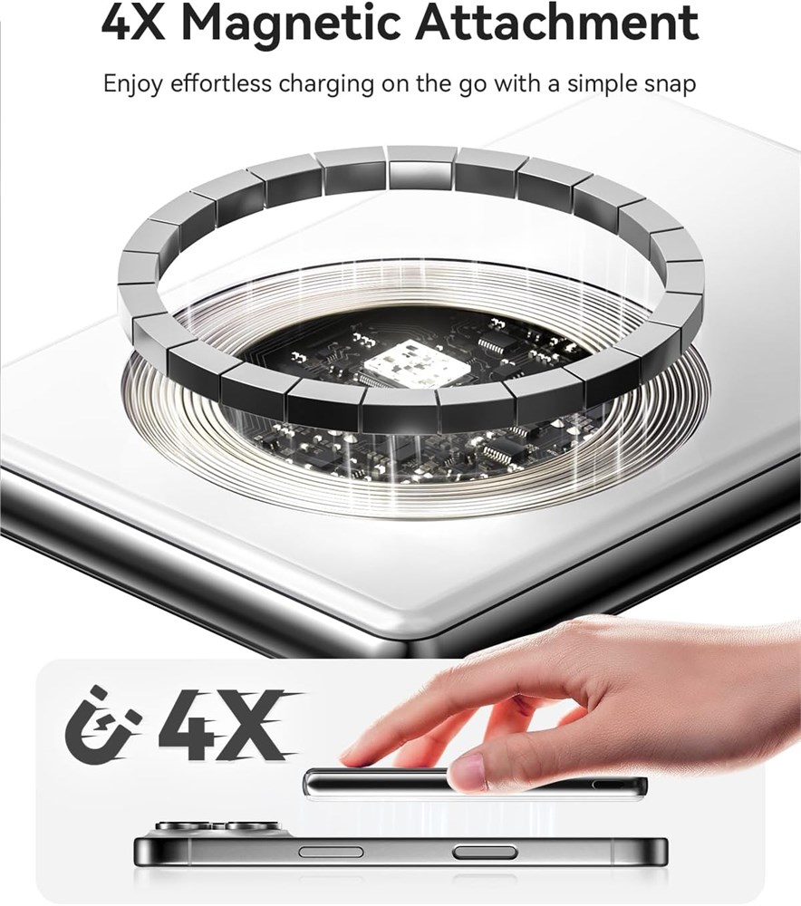 Two Times Extra Power: With a massive 10,000mAh capacity, this Kuulaa slim magsafe battery pack can charge your iPhone 13 Pro up to 1.6 times, wireless charges for 40 hours of video playback, while other 5,000mAh batteries drain fast and fail to give a full charge. Snap in Charge: Built-in strong magnets allow you to snap and charge iPhone 16/15/14/13/12, compatible with MagSafe. While charging, you can take selfies with the apple magsafe battery pack sticking tight to your phone, freely and effortlessly. (Note: Magnetic charging function is ONLY compatible with iPhone 16/15/14/13/12 series and magnetic cases.) PD20W USB C Fast Charging: Besides the Magnetic charging feature compatible with MagSafe, your iPhone 16/15/14/13/12 can even max out at 20W of power via the USB-C port when used with a cable, which is 3.5X faster than original chargers, which enable it to charge 2 devices at the same time, providing a safe, efficient and reliable charging solution for all your power needs. Sleek and Compact: Seamlessly fit this clutch charger iphone into your pockets or bags, thanks to its latest cell technology, the 10000mAh magnetic power bank realize the reduction of size but without compromising power and charging efficiency.