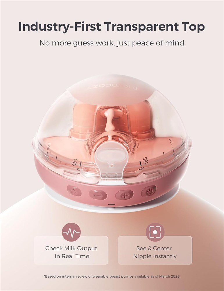 Ultra-Slim & Discreet Design At just 2.4 inches thick, this wearable breast pump is 20% slimmer than conventional pumps. It fits invisibly under clothing, allowing you to pump with complete privacy and confidence at work, on the road, or in social gatherings. Reclaim your freedom and comfort effortlessly. Transparent Top for Easy Alignment & Peace of Mind The industry-first transparent top lets you quickly confirm optimal nipple alignment for maximum comfort and efficiency. Watch your milk volume in real-time without interrupting your session, giving you visual reassurance that every precious drop is captured. All-Day Wireless Freedom & Portable Enjoy true cord-free convenience with the powerful 1800mAh charging case, which supports up to 15 pumping sessions or 5 days of use. Perfect for busy moms, whether you're powering through a work shift or relaxing at home no outlet needed. Smart App Control for Personalised Pumping Sync with the Momcozy app to customise pumping modes, track milk volume in real time, and receive Full Collector alerts. Turn each session into a calm, efficient, and personalised experience that adapts to your body's natural rhythm all from your phone. Easy to Clean & Assemble With only 5 parts to clean and no extra tools needed, the Air 1 Breast Pump is easy to assemble and maintain. The non-porous PPSU milk collector is designed for easy cleaning, so you can spend less time washing and more time enjoying yourself.
