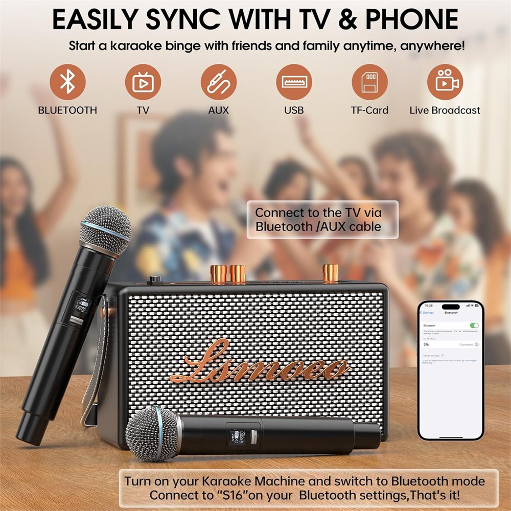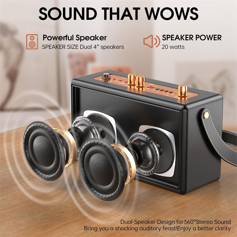All-In-One Karaoke System Featuring a high-density wooden chamber and precision acoustic engineering wrapped in premium eco-leather, this Retro karaoke machine suppresses resonance for deep, punchy bass and smooth, detailed highs. The natural warmth of wood delivers an immersive listening experience. Provide the ultimate music experience for your party, perfect for any occasion, from family gatherings to outdoor parties. MIC IN Multi-Adaptation Pro 6.5mm hybrid input with smart signal detection enables seamless switching, breaking through the traditional karaoke machine equipment limitations, audio can be connected to a variety of musical instruments, supporting 6.5mm standard electric guitar direct connection. Four-channel wireless microphone expansion, natively supports two wireless microphones access, and through the expansion, can be increased to four channels, with stable signal transmission, delivering zero-latency audio for studio-grade karaoke and live performances. Experience the Joy of Karaoke with Ease Just turn on the wireless microphones and they automatically connect to the Karaoke Speaker. The new generation of Bluetooth 5.3 chip technology karaoke machine can realize fast pairing and provide 20 meters of ultra-long transmission without disconnection. It also supports AUX/USB TF/OTG and external connection of your own headphones/microphone/electric guitar and other playing instruments. It is an ideal choice for personal gatherings, street performances, public campaigns, and other karaoke activities. Lightweight and portable, singing on the go Our karaoke speaker measures 9.9 x 5.7 x 4 inches and weighs 3.35 lbs, which is 45% lighter than comparable karaoke machines. Built-in 5000mAh RECHARGEABLE high-capacity battery, battery life up to 8-10 hours without stopping. Innovative retractable strap design, a buckle to go, easy to adapt to cycling excursions, outdoor weddings, camping parties, and other scenes. Whether you are traveling through the forest path or strolling along the beach, you can let the singing atmosphere follow you wherever you go. Vintage atmosphere, audio-visual enjoyment : Let this portable karaoke machine, which combines vintage fashion and practicality, show off your taste. Whether it is placed in the corner of the living room or the bedroom window, it can be quickly integrated into the environment, making this speaker an indispensable member of your home, and owning it means owning a wonderful audio-visual enjoyment. Karaoke configuration complete : A professional karaoke machine that meets all your needs! This set includes 1*karaoke machine, 2*wireless microphones for karaoke, 1*accompaniment cable, 1*Type-C charging cable, 1*detachable shoulder strap, and an instruction manual.