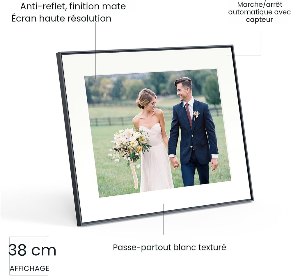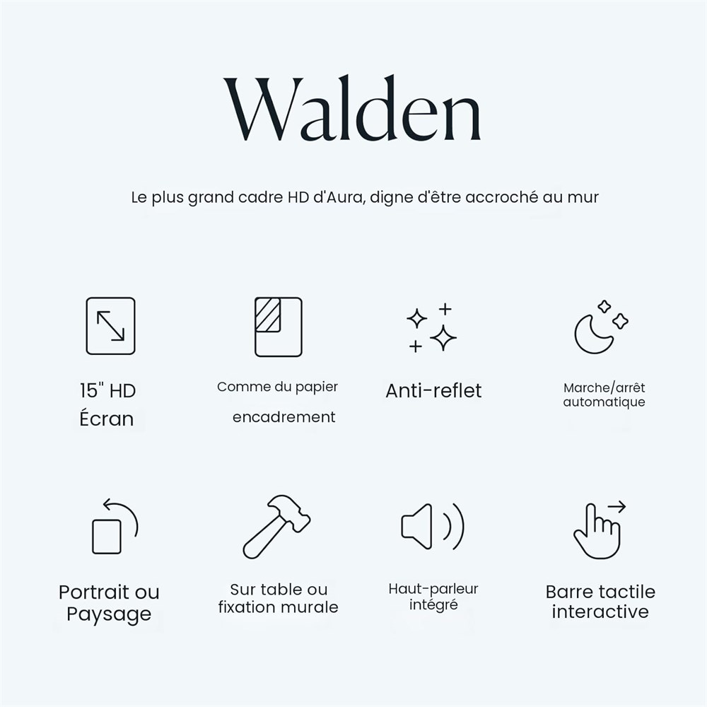 CADRE NUM RIQUE Wi-Fi LE MIEUX NOT : Des millions de clients sont ravis par Aura comme le moyen le plus simple de partager et d'afficher des photos avec leurs proches. Recommand par le New York Times/Wirecutter, Wired, et Oprah's Favorite Things. De votre t l phone leur cadre : envoyez des photos et des vid os directement depuis votre t l phone vers un cadre photo num rique Aura. Invitez votre famille et vos amis ajouter des photos de n'importe o dans le monde. Stockage gratuit et illimit . Pas de frais. Installation rapide et facile : configurez en quelques minutes sur WiFi et ajoutez instantan ment des photos et des vid os depuis votre t l phone en utilisant l'application gratuite Aura. Fonctionne avec les appareils Apple et Android. FONCTIONNALIT S INTELLIGENTES : Con u avec des mat riaux de haute qualit et un cran Full HD de 15" antireflet et talonn en couleur, le cadre double orientation Aura Walden ajuste automatiquement la luminosit de l cran, g re le recadrage des photos, s teint automatiquement la nuit, et plus encore. Comprend un haut-parleur int gr pour la lecture vid o. poser sur une table ou fixer au mur : notre plus grand cadre photo mural connect au Wi-Fi peut tre plac sur une table ou facilement accroch au mur. Support pour table et kit de fixation murale inclus. Priv et s curis : partagez des photos uniquement avec ceux que vous invitez, et vos photos restent toujours les v tres. Aura garde vos souvenirs les plus pr cieux en s curit .