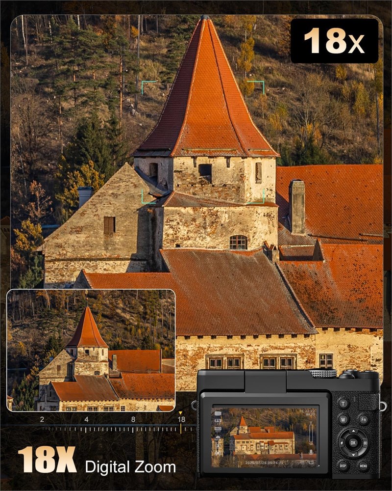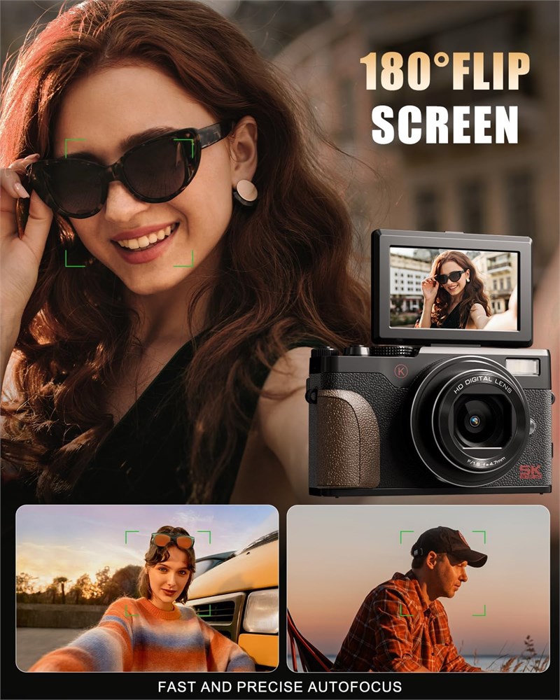 Cam ra de vlogging 5K : prenez de superbes vid os 5K et capturez des photos ultra haute r solution de 64 MP avec une clart bord bord. Rapprochez-vous consid rablement de l'action avec un puissant zoom num rique 18x pour des gros plans nets et d taill s de sujets loign s. Les appareils photo NBD pour la photographie des param tres ajust s en usine garantissent une exposition et une mise au point parfaites il suffit de pointer, de cliquer et de capturer du contenu de qualit professionnelle sans effort, m me pour les d butants. Appareil photo 64 MP pour la photographie : con u pour les voyageurs, cet appareil photo combine des vid os 5K et 64 MP dans une configuration compacte. L' cran rabattable 180 change la donne pour les vloggers solo, tandis que le fonctionnement intuitif un seul bouton permet de garder les choses sans stress lorsque vous explorez. Avec des filtres int gr s pour correspondre n'importe quelle humeur, des paysages vibrants aux sc nes de rue chaleureuses, vous aurez tout ce dont vous avez besoin pour raconter magnifiquement votre histoire de voyage. Appareil photo professionnel et convivial : pour les amateurs de photographie, votre m lange parfait de puissance professionnelle et de facilit L'objectif 4,7 mm F/1,8 offre des d tails nets, un beau bokeh et une qualit d'image de niveau professionnel, correspondant un quipement haut de gamme plus volumineux. Mise au point automatique rapide et pr cise m me en cas de faible luminosit . Con u pour tous, il est ultra-convivial : les d butants peuvent pointer et prendre des photos pour capturer les points forts de la vie sans tracas. Modes polyvalents et cadran physique : lib rez votre cr ativit avec des modes complets : photos nettes, vid os fluides, ralenti, time-lapses poustouflantes et filtres artistiques, le tout dans un seul appareil photo. Le cadran physique intuitif fonctionne en une fraction de seconde, pas de t tonnement de menu. Id al pour les clich s rapides et les prises de vue planifi es, il associe polyvalence et efficacit professionnelle. Cadeau id al et nombreux cadeaux : le paquet contient un appareil photo 5K et 64MP, 2 batteries, chargeur, carte SD de 64 Go et c ble USB. Charg d'accessoires, pas besoin d'acheter plus. Avec un design l gant et des fonctionnalit s haut de gamme, cet appareil photo est un cadeau id al pour les amateurs de photo, tout moment.