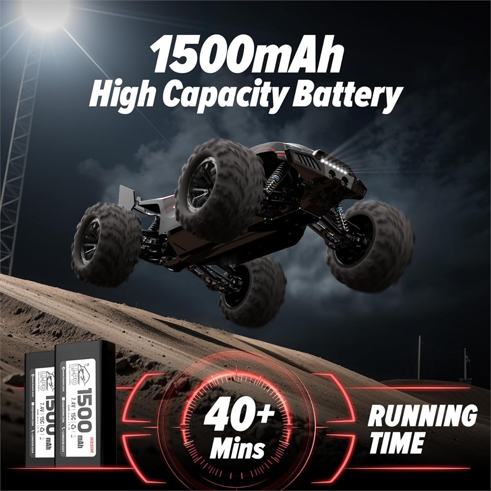 1:10 High-Speed RC Car Experience the thrill of high-speed racing with our large hobby rc car, equipped with a powerful 390 brushed motor, all-wheel drive system, LED lighting, and all-terrain tires. Perfect for any high-flying and all-weather adventure. Grab your transmitter, tear up the terrain on all four wheels, Experience the thrill of speed with our high-performance RC vehicles. Ready to Run The rc truck for adults features a high-power motor that allows for thrilling drifts around corners and impressive speeds on straightaways, reaching speeds of over 48+ km/h. The remote control car comes equipped with heat sinks to maintain optimal performance and prolong lifespan. Whether you're driving on sand, desert terrain, 45-degree slopes, water puddles, or grassy fields, this rc crawler can handle it all. High-Torque Steering Servo 3KG servo provides higher precision, better stability, faster response, and smoother acceleration. 30A ESC it delivers powerful torque and maximum speed, allowing the all terrain car to race on tracks, in parks, or on streets! Includes a remote monster truck transmitter with a range of up to 100 meters/328 feet and 2.4Ghz. It features responsive steering, braking, and throttle functions, allowing you to compete with friends or kids simultaneously. Beast RC Cars The Fast RC truck features a durable bathtub-style chassis that protects electronic components. Four metal shock absorbers and an off-road suspension system ensure enjoyment on various terrains. Huge trailing arm and heavy-duty linkages, along with functionallimit-straps, keep the solid axle firmly positioned. With its sleek design and powerful performance, this Remote Control truck is the perfect toy for boys and girls, providing fun for adults too! More than 40 MINUTES of PLAYTIME The off road rc car fast comes with 2 x 1500mAh high-quality batteries, allowing you to enjoy over 40 minutes of driving time (over 20 minutes per battery). Feel the adrenaline as you tear up the track with our high speed RC Trucks!