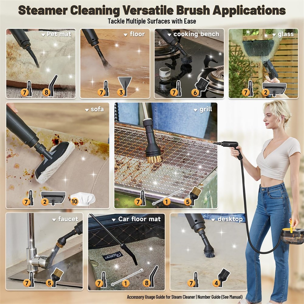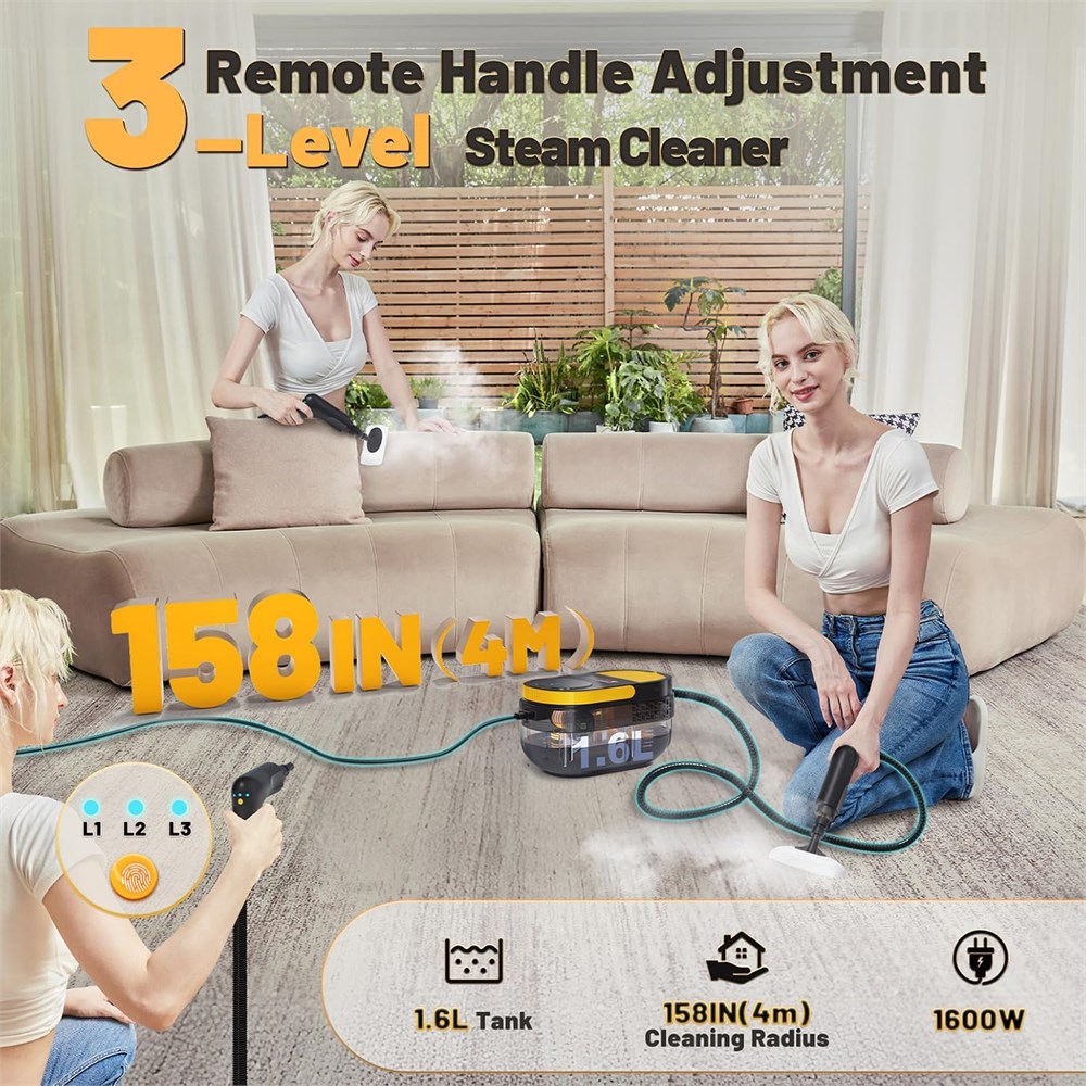 Material: Steam Cleaner is made from high-quality ABS material, ensuring excellent durability and heat resistance. This handheld steam cleaner features a sturdy design that withstands high temperatures, ideal for continuous use. The water tank, made from transparent high-strength material, allows users to monitor the water level easily. This pressurized steam cleaner is designed for reliability, making it perfect as a portable steam cleaner for home or mini steam cleaner for various surfaces Design: Steam Cleaner Handheld is equipped with a handle-mounted, three-level adjustable steam control function, ensuring precise output. Handheld steam cleaner comes with a 1.6L water tank for extended use, reducing frequent refills. With a total stretching distance of 158 inches, Steam Cleaner can easily reach high or distant areas, making it suitable for tasks like bathroom steam cleaner for shower and steam cleaner walls floor and furniture Features: Steam Cleaner operates with 1600W power, generating 3BAR pressure and steam at 212 F (100 C). Steam Cleaner Handheld heats up in just 15 seconds, delivering high-temperature steam to remove grime effectively. Handheld Steam Cleaner is ideal for tile and grout, making it a reliable steamer cleaning for bathroom. Compact yet efficient, this Steam Cleaner multipurpose for home ensures powerful cleaning Portable: Steam Cleaner includes a 2 Meters power cord and a 2 Meters steam hose, providing flexibility for cleaning. Compact (22 15 18 Centimeters), it is easy to store. This Steam Cleaner Handheld for all surfaces comes with nylon brushes, brass brushes, an extension rod, a glass brush, gloves, cleaning towels, and a microfiber pad. Perfect as a Hand held Steam Cleaner with glass attachment or portable steam cleaner, it s ideal for windows, furniture, and upholstery Occasion: Steam Cleaner Handheld is ideal for homes, offices, and vehicles. It excels as a grout steam cleaner for tile floors, a steam cleaner for bathroom, or even a car steam cleaner. Whether refreshing furniture or surfaces, this steam buggy steam cleaner ensures deep cleaning. As a multipurpose steam cleaner, it suits hard floors, carpets, and upholstery, making Handheld Steam Cleaner a versatile tool for all spaces.