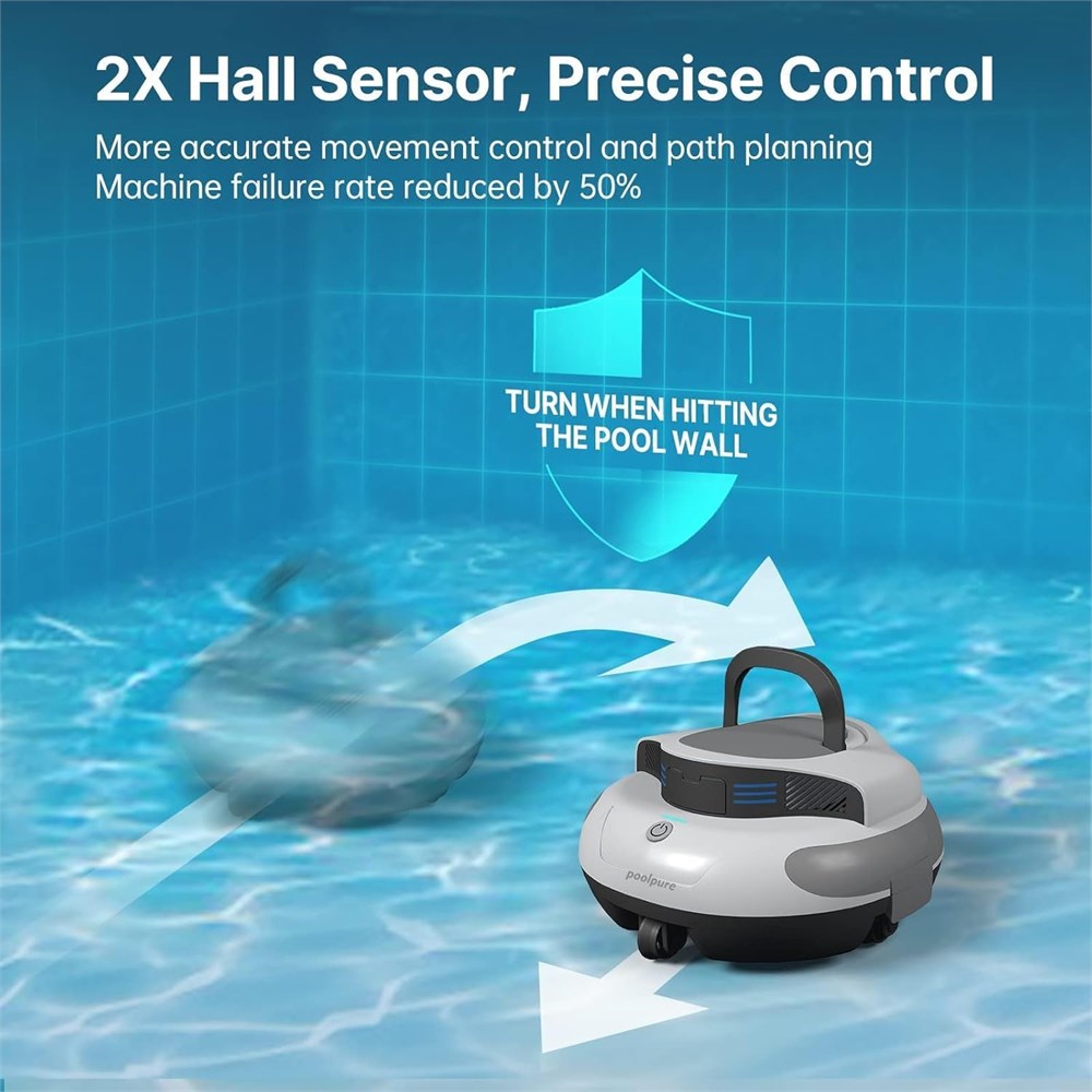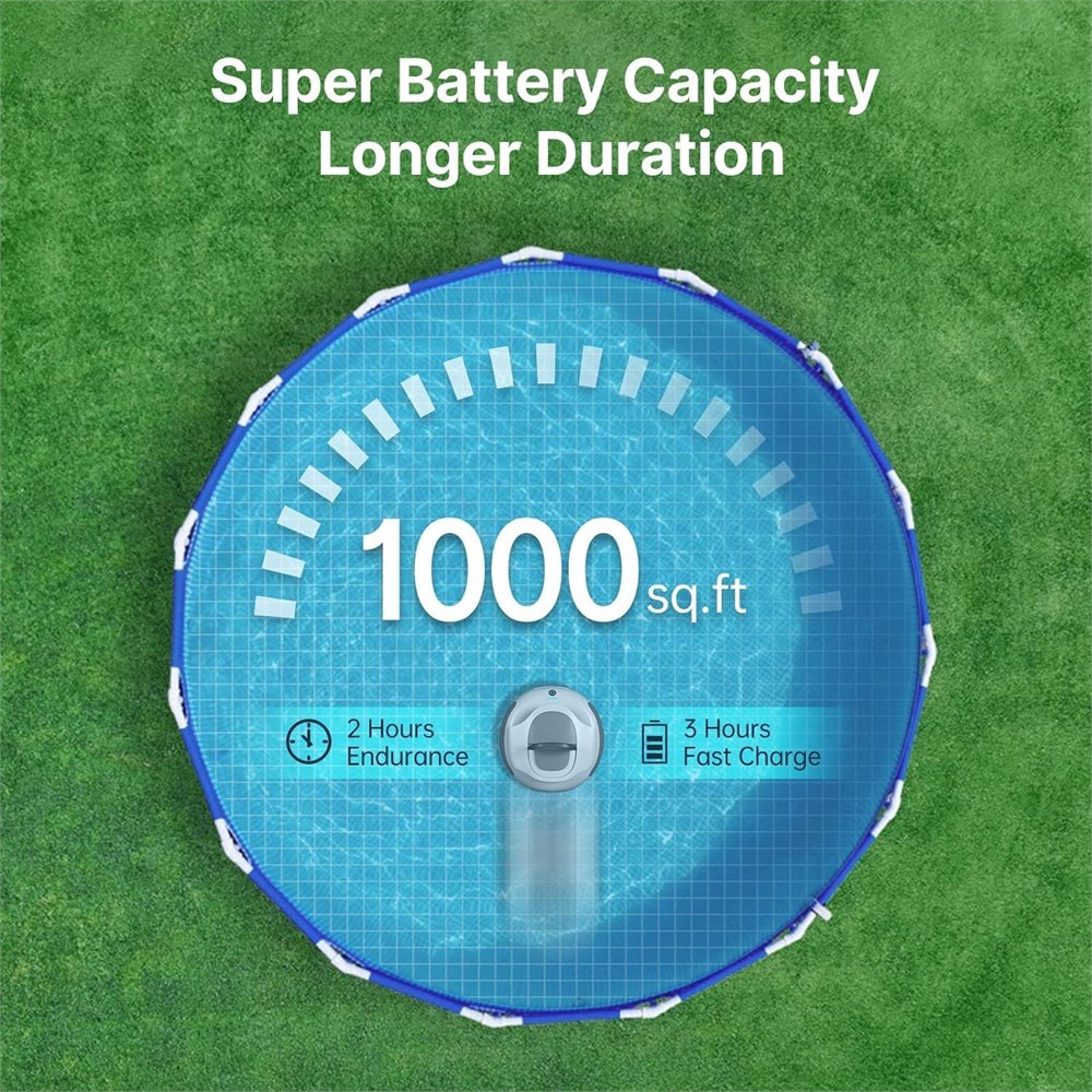 Cordless, Hassle-Free Cleaning Say goodbye to the hassle of tangled cords and cumbersome hoses. Our cordless and hoseless pool cleaner is powered by a 5000mAh internal battery, providing it with the freedom to move around your pool with ease. This allows you to sit back, relax and enjoy your sparkling clean pool. Intelligent Cleaning System & Deviation Correction Equipped with double the hall sensing power and a built-in advanced smart navigation system, the robot cleaner can navigate your pool with even greater precision, automatically adjusts cleaning paths to avoid circling in place ensuring every inch is cleaned to perfection. This provides a thorough and efficient cleaning experience.Minimizes redundant cleaning, saving time and energy. More Coverage, Less Charging Time With a 5000mAh high-capacity battery, our pool cleaner can provide up to 120 minutes of continuous cleaning time, covering an area of up to 1000 square feet. It is perfect for round above-ground pools (up to 33' diameter) and in-ground flat-floored pools (up to 40' X 20'). A full charge takes only 2.5-3 hours, meaning less time charging and more time enjoying your pool. Efficient Cleaning Equipped with two powerful motors, two high-quality scrapers, and a suction port up to 4 inches wide, the pool cleaner easily removes dirt, debris, and hair from your pool, leaving it sparkling clear and healthy. Self-Parking With built-in self-parking technology, the robotic pool cleaner will park near the pool wall when the battery level drops below 5% or after completing a cleaning cycle for easy retrieval. Just use the included hook to lift it out of the water.