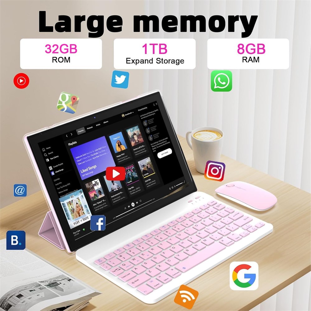 Android 14 OS + Google GMS Google GMS Certified Tablets comes with the latest version of Android 14 OS to provide you with a personalized and secure system experience. Not only can you enjoy stable and smooth Google services, but you can also install your favorite third-party apps such as YouTube, Facebook, Netflix, Prime Video and more. 8GB RAM+64GB ROM Tablet This 10.1 inch android 14 tablet adopt 8GB (2GB+6GB virtual memory) RAM+64GB ROM. Large capacity RAM storage support you to run multiple software smoothly. A high-performance processor with a main frequency of 1.8GHZ ensures multitasking and faster software opening speed, You can use Micro SD Card to expand it to 1TB to download and store your favorite books, songs, photos, movies, games applications. 2 in 1 Tablet Computer With Accessories This 2 in 1 computer tablet with bluetooth keyboard, wireless mouse, foldable protective case, stylus and USB-C cable. So that this 10 inch tablet can be used as a laptop or use as a traditional tablet. Tablet adopt a 6000mah big capacity battery and a low-power processor. Achieve up to 10 hours mixed use. Perfect for reading, watching movies, dramas. Tablet includes all the accessories you need, easy package save much. 10 "Large screen + Eye protection The resolution of a home tablet is 1280 * 800 IPS. The 10.1-inch tablet features an ultra-thin bezel design and a sensitive multi touch high-definition screen. Equipped with 8MP+2MP front and rear dual cameras and dual speakers, with a large screen design and more detailed and bright color expression, bringing you a higher level of audio-visual enjoyment. Dual Carema & Speakers Front 2.0 Mega pixel, back 8.0 Mega pixel camera with flash light to capture sharp photos and make smooth video chats. IWEGGO tablet is equipped with dual speakers, which brings more powerful audio. Meet your daily needs, such as watching videos, live, ball games, listen to musice, etc.