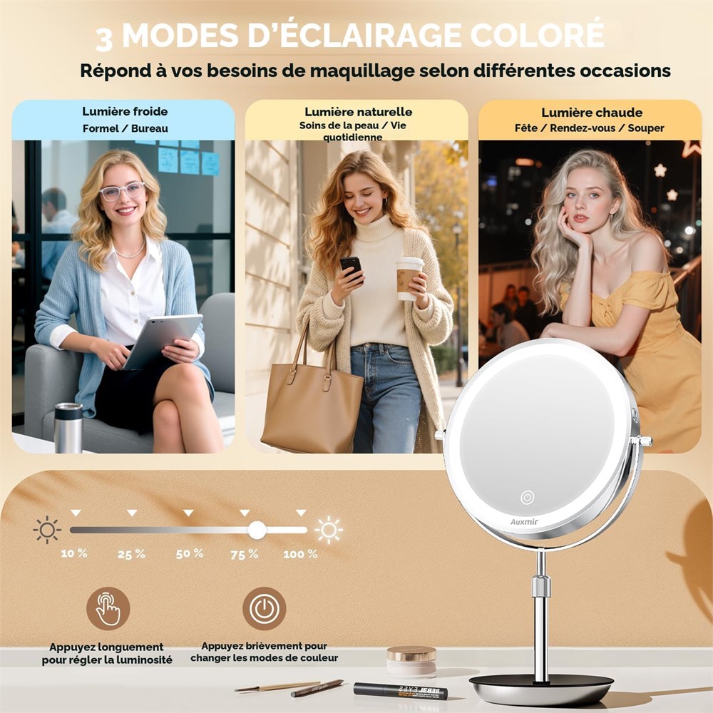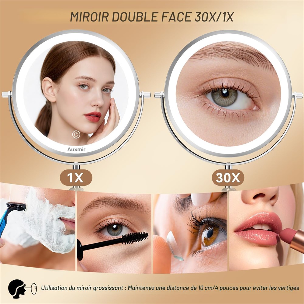 Miroir HD de 22,9 cm et grossissement x30/1 : fabriqu en m tal et verre de qualit sup rieure, ce miroir grossissant offre une clart exceptionnelle sur ses deux c t s. Le c t standard 1X offre une vue large et sans distorsion, id ale pour perfectionner votre application de maquillage complet du visage. Retournez sur le c t grossissant 30x pour des t ches de pr cision telles que l' pilation des sourcils ou le d tail de l'eyeliner (Conseil : restez moins de 10,2 cm pour viter les tourdissements) Hauteur r glable et rotation 360 : ce miroir de maquillage a une hauteur r glable pour s'adapter votre confort, parfaitement adapt aux tables de coiffeuse de diff rentes hauteurs. Il dispose galement d'une rotation transparente 360 , vous permettant de basculer facilement entre les d tails en gros plan et les vues compl tes du visage pour une utilisation pr cise et sans tracas 3 modes de couleur et gradation progressive : quip de 60 LED lumineuses, douces et non blouissantes, ce miroir de maquillage grossissant offre 3 options d' clairage : lumi re froide, lumi re naturelle et lumi re chaude. Appuyez bri vement pour passer au mode d' clairage souhait , et appuyez longuement sur la commande tactile intelligente pour r gler la luminosit , s'adaptant chaque sc nario quotidien tout en prenant soin de vos yeux Batterie rechargeable de 3000 mAh : emball avec une batterie rechargeable de 3000 mAh de haute capacit , ce miroir de maquillage lumineux prend en charge 8,5 heures d'utilisation sans fil sur une charge compl te, plus de cordons emm l s qui limitent votre espace. La minuterie d'arr t automatique de 30 minutes permet d' conomiser de l' nergie et prolonge la dur e de vie de la batterie, tandis que le port de charge universel de type C (compatible avec les ordinateurs portables, les banques d'alimentation ou les chargeurs muraux) garantit qu'il est toujours pr t lorsque vous en avez besoin Le miroir de maquillage Auxmir est fabriqu partir de m tal et de verre de qualit sup rieure ; nous offrons une garantie de remplacement de 3 ans, donc si vous avez des questions apr s votre achat, nous sommes l pour vous ; que vous cherchiez l'acheter pour votre propre usage ou pour offrir un cadeau quelqu'un de sp cial, nos miroirs sont le choix parfait.