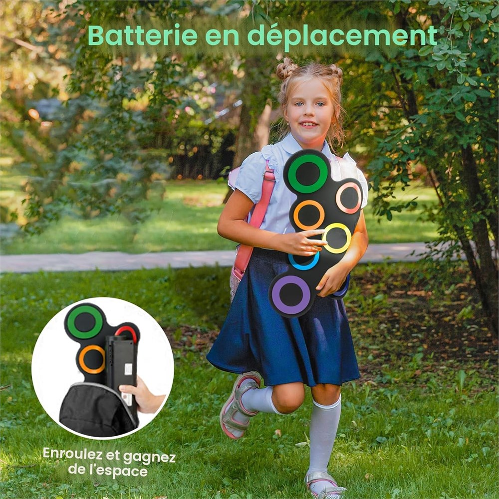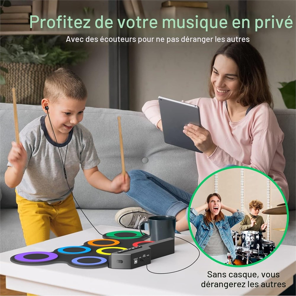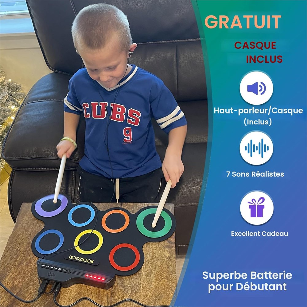 Ensemble de batterie 7 pads pour d butants Le kit de batterie lectronique Rocksocki contient tous les tambours dont vous avez besoin pour commencer : 3 toms, 1 HI-HAT (les positions SNARE et HI-HAT peuvent tre chang es selon les diff rentes habitudes d'utilisateur), 1 SNARE, 1 RIDE, 1 CRASH et 2 p dales pour la grosse caisse et le HI-HAT ; c'est le kit de batterie parfait pour les enfants g s de 3 8 ans qui veulent s'exercer et jouer de la batterie Deux fa ons de jouer : vous pouvez le connecter n'importe quel haut-parleur externe pour profiter du son. Ou pour ne pas d ranger les autres, vous pouvez galement connecter le casque (inclus) lorsque vous jouez de la batterie. Tambour en route Notre set de batterie pour enfants est facile ranger, ne prend pas beaucoup de place, vous pouvez donc le rouler, le ranger dans votre sac pour l emporter partout pour des f tes en plein air, des r p titions de ch ur, en studio, des cours de musique/batterie Deux options d'alimentation Aliment par 2 piles AAA ou DC 5 V via le c ble USB inclus pour jouer la batterie. Rangez-le dans votre sac pour le jouer n importe o . Cadeau de jouet musical id al Le tambour est facile transporter, une vari t d'effets de batterie peuvent tre pratiqu s, et vous pouvez apprendre tout moment et n'importe o avec d tente et bonheur. Cadeau musical parfait pour un anniversaire, une pratique scolaire, No l.