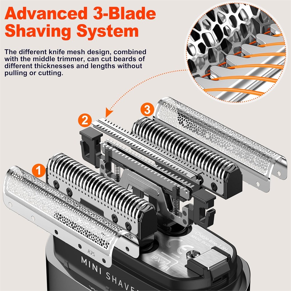 Exp rience de rasage de pr cision : apr s de nombreux tests ergonomiques, nous avons con u le filet couteaux id al et la disposition de la lame. Les rasoirs lectriques pour homme peuvent capturer une barbe plus courte et paisse, couper facilement les poils du visage, du cou, de la m choire ou m me de la t te chauve sans tirer. La lame de rasoir douce pour la peau vous permet de profiter d'un rasage lisse et propre sans irritation de la peau.