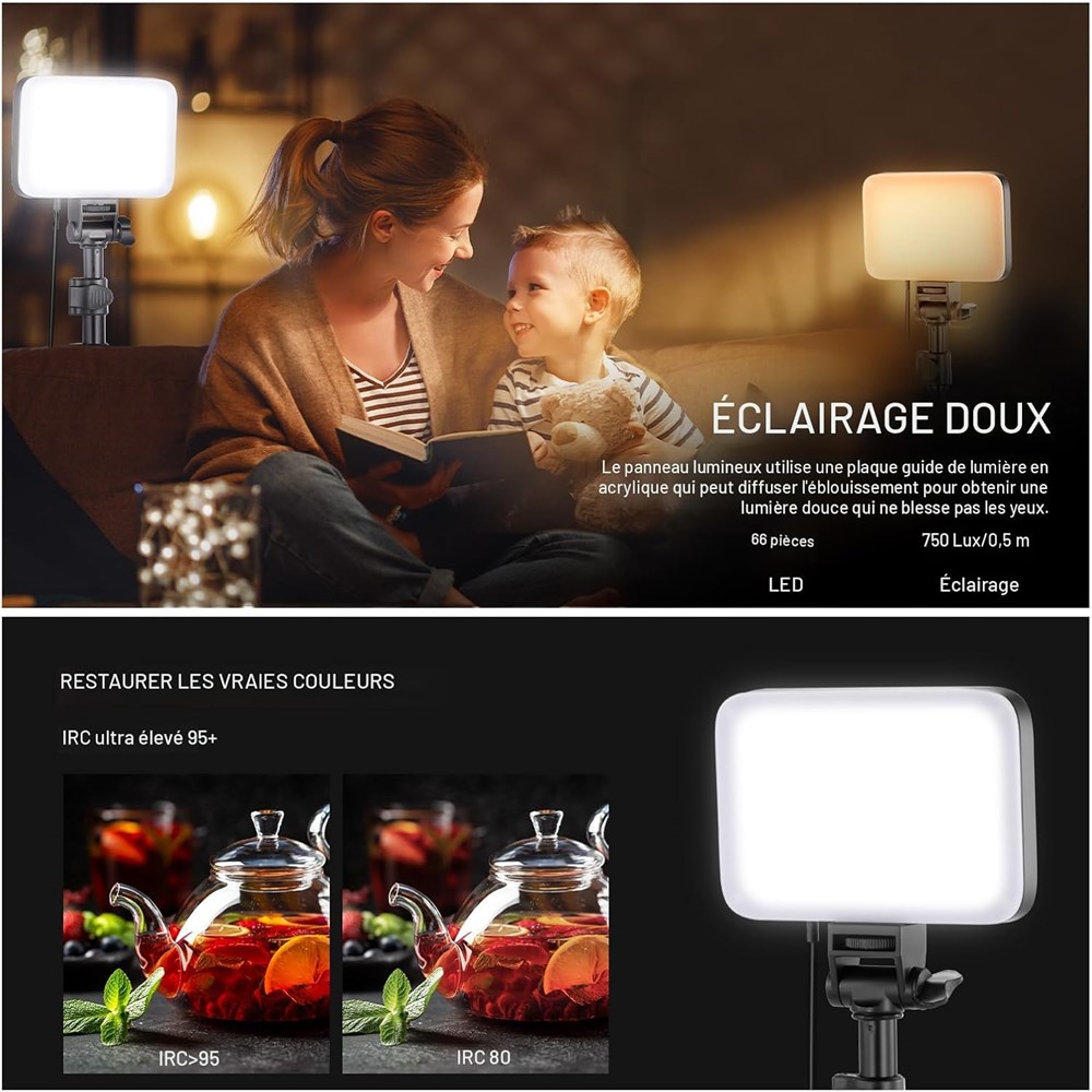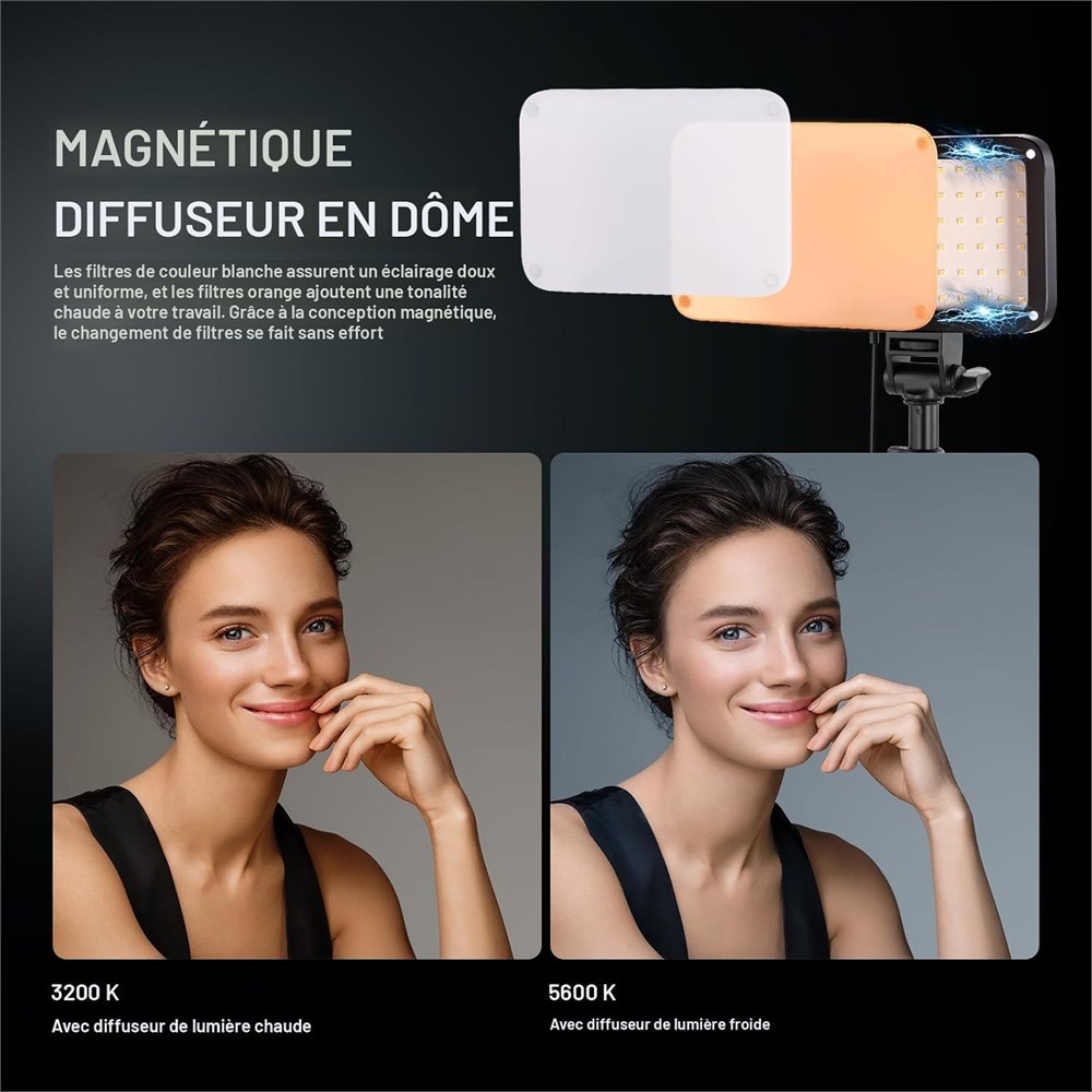 Pr sentation de NEEWER BASICS Simple et pratique, NEEWER BASICS est une gamme de produits conomiques qui se concentre sur les fonctions et les designs essentiels, sans extras et mat riaux inutiles. Kit d' clairage vid o panneau LED bicolore L' quipement d' clairage de studio de 10 W avec 66 LED offre jusqu' 750 lx/0,5 m (avec filtre de couleur attach ), avec une temp rature de couleur bicolore de 3200 K et 5600 K, CRI > 95. Inclut 2 supports de lampe de photographie portables et 4 filtres, id aux pour les artistes en maquillage des cils (eyelash), les esth ticiennes, les tatoueurs, les coiffeurs, les selfies, l'enregistrement vid o des r seaux sociaux TikTok/YouTube, les podcasts, FaceTime, les appels Zoom, les vid oconf rences, le streaming en direct, le vlogging, le tournage, la s ance photo avec appareil photo Options d' clairage vari es La petite lampe vid o LED offre 10 niveaux de luminosit pour un contr le flexible de l' clairage : appuyez bri vement pour ajuster par tapes, ou appuyez longuement pour un ajustement progressif continu. Les filtres de couleur blancs assurent une illumination douce et uniforme, et les filtres orange ajoutent une tonalit chaude votre travail. Avec le design magn tique, le passage entre les filtres est sans effort Hauteur et angle r glables pour une utilisation polyvalente Dot d'une inclinaison 180 et d'une plage de hauteur r glable de 19,7" (50 cm) 53,2" (135 cm), le support de panneau lumineux est id al pour capturer des prises de vue a riennes, vers le haut ou verticales. Il sert galement de tr pied de table ou peut tre pli en une perche selfie pour une utilisation portable. La vis sup rieure de 1/4" permet de monter divers accessoires de photographie tels que des clairages vid o LED, des supports pour t l phone (NON inclus), ou des adaptateurs pour cam ra d'action (NON inclus) pour une prise de vue flexible Alimentation USB pratique La lampe selfie pour t l phone de bureau fonctionne 5 V/2 A, avec un c ble de charge de 2 m/6,6 pi int gr , peut tre aliment e par l adaptateur ou charg e via un port USB sur des crans, des ordinateurs portables, des ordinateurs ou des chargeurs portables, assurant une alimentation ininterrompue tout au long de la journ e. Remarque : une fois connect , un voyant LED bleu s'allume. Appuyez ensuite sur le bouton d'alimentation pour allumer ou teindre le panneau lumineux.