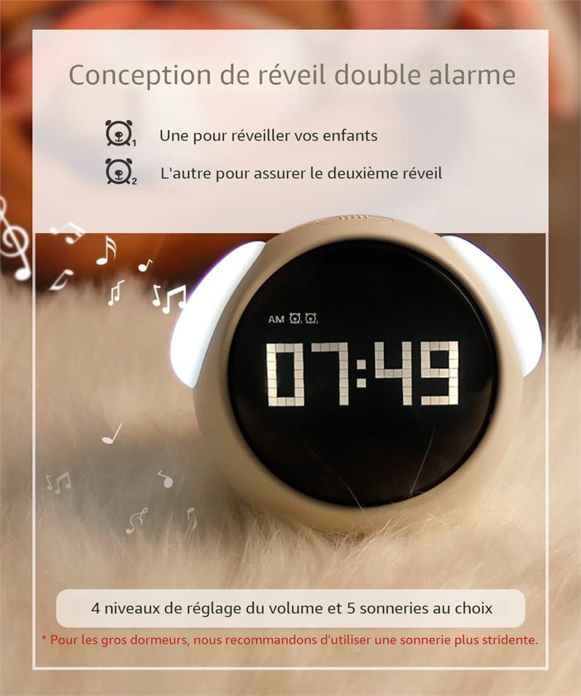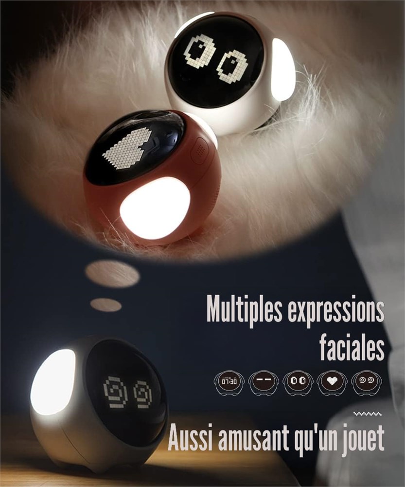 Double r glage de l'alarme : deux r veils peuvent tre r gl s, choix humanis pour changer librement. Parall lement, il y a cinq sonneries au choix et quatre niveaux de volume r gler. Les enfants peuvent choisir leur sonnerie pr f r e et le volume appropri pour chaque r veil, ce qui leur permet de profiter de la personnalisation de leur propre r veil. Horloge intelligente Emoji : inspir e des chiots, MikoDream en r f rence leur apparence et leur expression, a con u le nouveau r veil mignon. Si vous r veillez l'horloge, elle fera appara tre de jolies expressions mignonnes, ce qui cr e une interaction ludique et amuse les enfants. Veilleuse chaude : luminosit r glable. Au moment du coucher, lorsque la veilleuse est allum e et r gl e une luminosit adapt e au sommeil, elle prot gera le chevet d'une lueur chaude. En mode activ par la voix, tapoter ou mettre un son peut r veiller les lumi res, de sorte que vos enfants n'auront plus peur de l'obscurit la nuit. FONCTIONNALIT R VEIL DIFF R : Utilisation d'un r veil humanis pour les enfants, pour commencer doucement et confortablement une nouvelle journ e. Lorsque cette horloge d alarme sonne, la secouer entrera en mode r p tition. Apr s 5 minutes, l'alarme sonnera nouveau. Ce mode peut tre r p t l'infini jusqu' ce que le bouton du haut soit cliqu pour teindre l'alarme. CHOIX CADEAU PARFAIT : MikoDream est fid le la philosophie de d velopper des produits m nagers qui apportent un grand bonheur la vie. Avec des expressions novatrices et un design adapt aux enfants, les horloges sont parfaites pour les anniversaires, la f te de tous les saints, No l et d'autres c l brations.