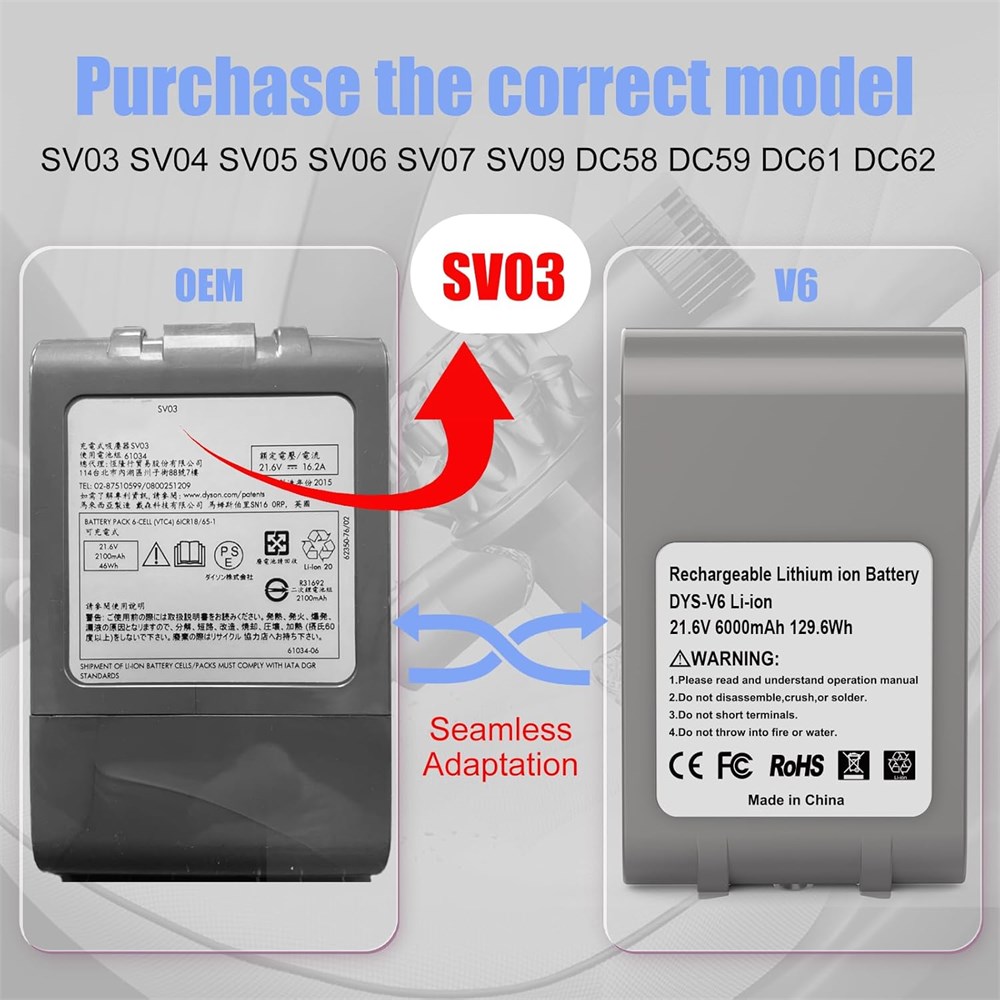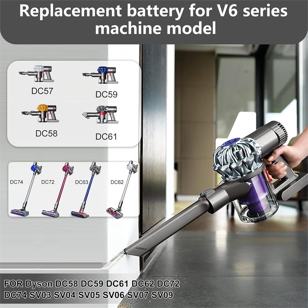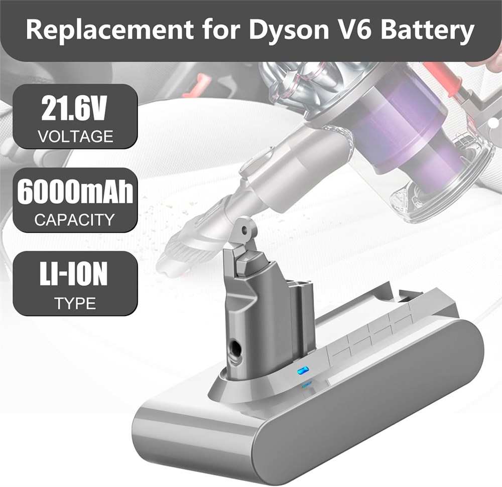 Type de batterie : Li-ion. Tension : 21,6 V. Capacit : 6000 mAh. Durent 40 % plus longtemps que les originaux. (Le paquet contient 2 filtres de rechange Dyson). Compatible avec la s rie d'aspirateurs Dyson Animal V6, DC58, DC59, DC61, DC62. Les performances sont confirm es comme tant quivalentes aux batteries Dyson d'origine et s'adaptent aux chargeurs Dyson V6. Fabriqu e avec une batterie de haute qualit , aucun effet de m moire, peut tre charg e ou d charg e selon les besoins sans perte de capacit . Grande capacit de 6000 mAh pour faire fonctionner votre aspirateur plus longtemps que les autres. un peu plus lourd (400g chacun) mais ne provoque pas plus de fatigue pour l'utilisateur par rapport aux batteries d'origine Indicateur de charge int gr : le bleu fixe signifie la charge, la lumi re teinte signifie que la charge est termin e. Le clignotement jaune signifie qu'une erreur s'est produite, vous pouvez r essayer ou nous contacter, nous offrons un service apr s-vente rapide 24*7 heures. Garantie : remboursement de 45 jours, garantie fabricant de 12 mois et service client amical vie. Tous les produits pour le remplacement de la batterie d aspirateur sans fil dyson sont certifi s CE FCC PSE ROHS.