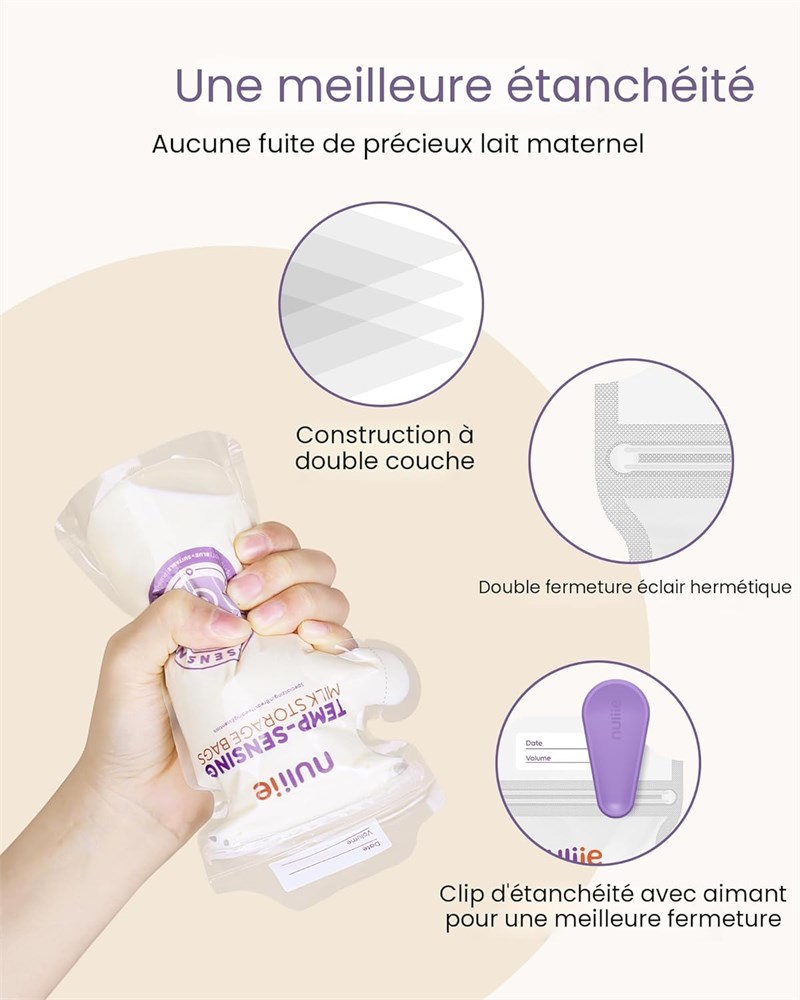 D tection de temp rature pour une alimentation en toute s curit : avec un ic ne de d tection de temp rature plus grand et facile voir, les sacs lait Nuliie pour le lait maternel vous permettent d valuer instantan ment la temp rature du lait. Des instructions claires et conviviales sur chaque sac de stockage de lait maternel garantissent un stockage s r et une d cong lation sans effort. Clip de fermeture magn tique pour un rangement facile : Chaque sac lait maternel comprend un clip fermeture rapide pour une fermeture s curis e. L'aimant int gr vous permet de le fixer au r frig rateur, gardant vos sacs de lait maternel bien rang s et faciles d'acc s si n cessaire. Protection solide et tanche : con us avec des fermetures glissi re doubles, des bords renforc s et une construction double couche, ces sacs de rangement pour lait maternel sont durables et tanches, assurant que chaque goutte reste en s curit , qu'ils soient rang s debout ou pos s plat. Versement sans d sordre et prise en main facile : le bec verseur facile d chirer assure un versement fluide et contr l , tandis que le design ergonomique double C offre une prise en main confortable, ce qui rend le transfert de lait avec des sacs de stockage de lait maternel sans effort et sans d versement. Mesures pr cises et mat riaux s rs : les marquages de capacit clairs aident suivre votre approvisionnement en lait. Fabriqu s partir de poly thyl ne + PET de qualit alimentaire 100 % sans BPA, ces sacs de lait maternel favorisent la cong lation et la d cong lation rapides, pr servant les nutriments essentiels pour votre b b . Suivi de la date et du volume pour la fra cheur : Les tiquettes de date et de volume pr -imprim es sur chaque sac de lait rendent le suivi du stockage simple et organis , garantissant que votre b b re oive toujours du lait frais et riche en nutriments chaque t t e.