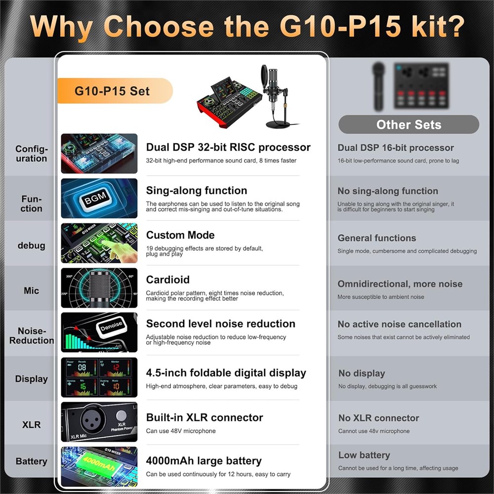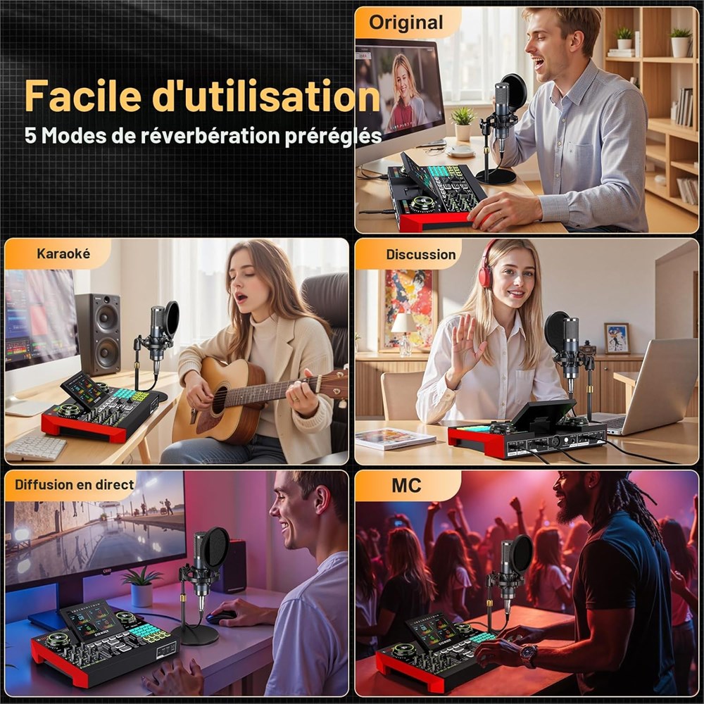 Kit d' quipement de baladodiffusion Comprend le microphone P15, le mixeur audio tenlamp G10, un support de microphone, des couteurs de monitoring, un c ble d'alimentation et un c ble OTG. Cette configuration de studio professionnelle est sp cialement con ue pour les podcasts, le streaming en direct, l'enregistrement et la cr ation de courtes vid os. Vous recevrez un ensemble complet d' quipement de podcast professionnel, liminant le besoin d'acheter des appareils suppl mentaires. Cette solution tout-en-un est parfaite pour les podcasteurs, les joueurs, les streamers et les cr ateurs de contenu qui enregistrent des vid os et diffusent en direct. Interface audio multicanal : la carte son G10 prend en charge deux entr es microphone de 3,5 mm, les entr es microphone XLR et dynamique de 6,5 mm, la sortie de surveillance du casque et l'entr e instrument. Avec une connectivit polyvalente, il se connecte facilement aux smartphones, ordinateurs, haut-parleurs, couteurs et guitares. Il am liore vos capacit s de diffusion en direct et de cr ation de contenu de podcast. Facile utiliser Mixeur de podcast, la table de mixage G10 est livr e avec un port USB pour se connecter un PC, et peut tre connect e un t l phone portable l'aide d'un c ble OTG. Remarque : apr s r ception du microphone condensateur, veuillez d'abord le charger. Si vous avez des questions pendant l'utilisation, veuillez nous contacter temps nous allons r soudre le probl me pour vous dans les 12 heures. Une atmosph re unique de streaming en direct : le mixeur de microphone G10 dispose d'une r duction du bruit int gr e 2 niveaux, de 12 niveaux de tonalit lectronique et de 16 effets sonores amusants. Il comprend 3 contr les de tonalit r glables (aigus, m diums, basses) et un bouton de contr le de hauteur de ton, ainsi qu'une fonction de changement de voix. Que vous soyez d butant ou professionnel, vous pouvez facilement et enti rement contr ler le rythme de votre diffusion en direct. Qualit sonore sup rieure Le microphone de podcast P15 est sp cifiquement con u pour r pondre aux besoins des enregistrements de chant, de streaming en direct, de voix off et de diffusion. Son motif cardio de se concentre davantage sur votre voix, et le cache en mousse inclus r duit les sons plosifs pendant la parole tout en isolant efficacement le bruit des appareils lectroniques proximit , assurant une qualit audio plus claire.