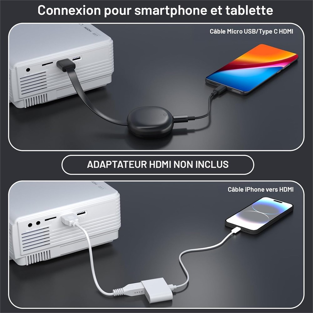 Technologie Bluetooth 5.2 bidirectionnelle am lior e Ce projecteur portable dispose de la derni re technologie Bluetooth 5.2 bidirectionnelle. Cela signifie qu'il peut tre facilement connect aux haut-parleurs Bluetooth et galement utilis comme haut-parleur pour se connecter des smartphones et tablettes. Surprise Cette fonction r sout le gros probl me que la plupart des projecteurs sur le march ne peuvent pas se connecter un smartphone ou un ordinateur portable avec Bluetooth. Prise en charge de la r solution 1080p Ce mini projecteur vid o dispose d'une sortie de lumi re couleur am lior e, la r solution native est de 720p et prend en charge 1080p, ce qui offre une qualit d'image Full HD claire, dynamique et aux couleurs vives. Avec la derni re technique de traitement d'image et 80 % de luminosit des couleurs am lior e par rapport d'autres projecteurs typiques, ainsi qu'une luminosit blanche accrue de 90 %, ce mini projecteur LCD de 10,2 cm facile utiliser et transporter est un v ritable rapport qualit /prix. cran de projection portable inclus Notre projecteur portable comprend un cran de projection de 203,2 cm qui est con u pour r pondre aux besoins de nos clients. Contrairement d'autres projecteurs, notre cran de projection inclus vous permet de configurer votre propre home cin ma n'importe o pour regarder des films, des missions de t l vision, des photos et jouer des jeux vid o. Cet cran de projection portable, pliable, anti-plis et facile laver de 203,2 cm est un bonus suppl mentaire, parfait pour un usage quotidien home cin ma. Projecteur avec large compatibilit Ce projecteur de film d'ext rieur est quip de plusieurs ports pour une utilisation facile, y compris un HDMI int gr , USB. Vous pouvez connecter ce projecteur une cl TV directement, ainsi que des consoles de jeux, PC, smartphones, tablettes, ordinateurs portables, lecteurs DVD, cartes Micro SD et cl USB, etc. Faible bruit et longue dur e de vie de la lampe Le mini projecteur est plus silencieux et plus durable que les mod les pr c dents gr ce la technologie avanc e de refroidissement par ventilateur. Le puissant syst me de refroidissement refroidit efficacement la chaleur de la lampe, prolongeant la dur e de vie de l'ampoule 50 000 heures, ce qui signifie que vous pouvez l'utiliser plus de 15 ans.