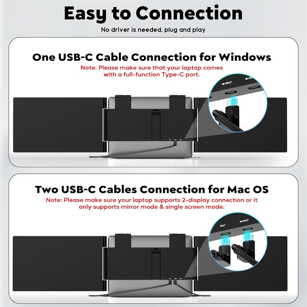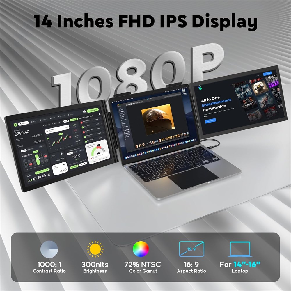 Easy connection & Widely Used : This Laptop Screen Extender has 3 USB-C ports, When connected to Windows, Only One USB-C cable needs to be used. When connected to macOS, two USB-C cables need to be connected. No driver or APP need. This screen extender is specifically designed to fit laptops ranging from 14" to 16". Note: Please make sure your MacBook supports 2-display connection or it only supports mirror mode & single screen mode. Exceptional Visual Performance HONGO 14 inch External Monitor for Laptops provides 1080P FHD IPS screens, With a brightness of 300 nits and a contrast ratio of 1000:1, the portable monitor ensures a clear and visually stunning workspace. In addition, the dual monitor support 270 rotation, and the bracket can be adjusted 180 , you can adjust according to your own needs. Triple Laptop Monitors This screen extender portable laptop allows you to have three screens for office work in one second, enhance your productivity by up to 300%, allowing you to efficiently multitask with multiple windows. Say goodbye to the inconvenience of constantly switching between applications on a single laptop. Ideal for individuals who are always on the go, remote workers, IT professionals, movie enthusiasts, programmers, and more! Widly Compatible Compatible with Windows and macOS systems, ideal for 14"-16" inch laptops. Support Extend/Mirror/2nd Screen/Portrait/Pre Mode. Each screen of this laptop monitor extender can be adjusted, turned off, and awakened individually. Note: Your device must have Thunderbolt 3.0/4.0 or USB 3.1 Type-C DP ALT-MODE port. Portable The laptop monitor extender is lightweight at just 3.48LB, foldable and compact design allows this laptop extender screen to easily fit into a bag, making it perfect for travel and business trips.