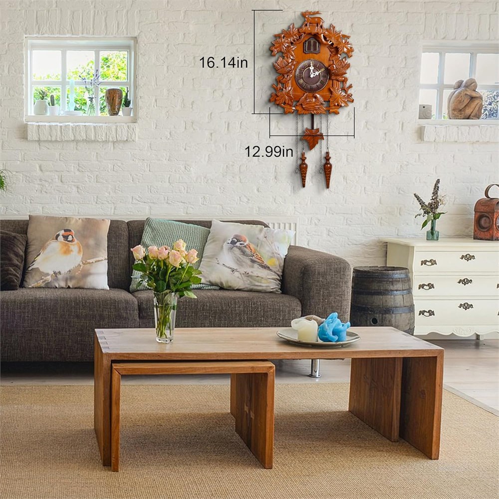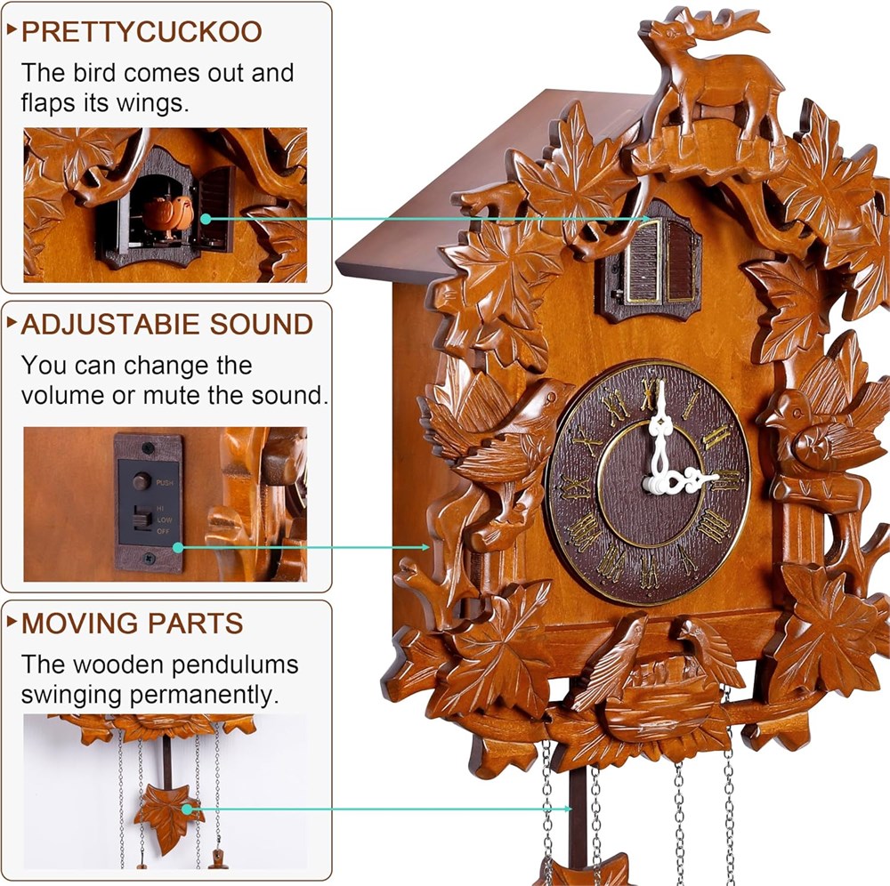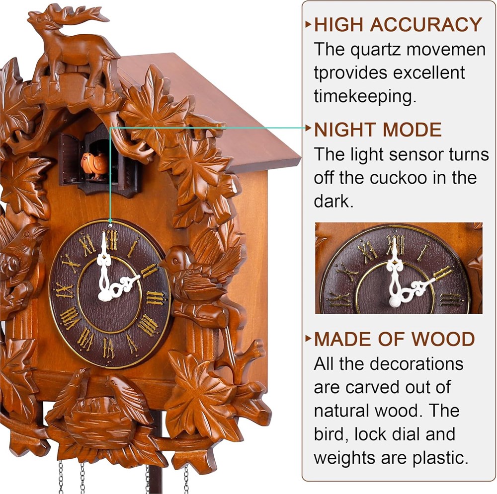 Solid Wood, Forest Deer style cuckoo clock with hand-carved decorations. The bird comes out and sings co co every Hour. Automatic Night Shut Off Sensor -- night silencer. Adjustable Volume - (High, Low or Shut off). Two D Battery Operated (not included) . Dim: 16.14"(H) (not include the length of the tails) x12.99"x6.3"