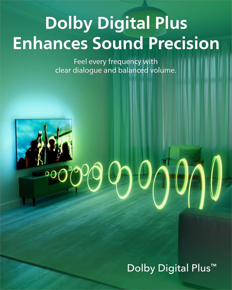 ENHANCED TV SOUND: This 2.0-channel, 120W soundbar boosts audio for movies and shows, delivering louder, clearer, and richer sound. Adjust treble and bass via remote to match your mood. Ideal for music and action scenes. Feel laser blasts and crowd roars! LEVEL UP YOUR TV SOUND: With DTS Virtual, you can enjoy immersive 3D audio, and don't need extra speakers! Activate it via remote or PHILIPS app. Plus, Dolby Digital Plus adds depth, making each scene feel vivid. Get front-row sound for movies and games. CUSTOMIZE YOUR AUDIO: Use the PHILIPS app or remote to select from four EQ modes (Movie, Music, Voice, Stadium) for tailored entertainment or to enable virtual surround or enhance voices. Night Mode is designed for nighttime viewing. SIMPLE SETUP & EASY CONTROL: Experience a seamless setup and quick access to sound settings, fully compatible with any Roku TV remote. This soundbar connects via HDMI ARC, enabling control of both your TV and soundbar with just one remote. MULTIPLE CONNECTION OPTIONS: Pair with your smartphone via Bluetooth 5.4. Connect music sources using Aux-in or USB, or enjoy immersive sound through optical input or HDMI ARC. Experience incredible sound quality with any connection. MODERN DESIGN: Made with distinctive materials, this soundbar features a sleek, low-profile slanted design. Included wall brackets allow versatile placement set it on a TV stand, mount on the wall, or position on any flat surface.