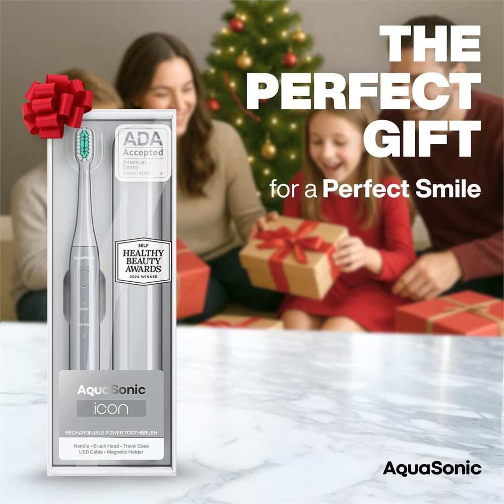 ADA-Approved: AquaSonic Icon rechargeable electric toothbrush has earned the American Dental Academy s prestigious seal of approval. Boost Your Brushing: Use the same brushing technique as a manual toothbrush, while Icon produces micro-vibrations to enhance the cleaning effect. Modern Technology: Icon features 2 brushing modes, and a built-in smart timer that signals every 30 seconds and shuts off after 2 minutes. Its lithium-ion battery holds a charge for 30+ days of brushing. Sleek Storage: Comes with a magnetic holder and an ultra-slim travel case, to keep Icon clean and easily accessible when not in use. Includes: toothbrush handle, brush head, magnetic holder, travel case, charge cord.
