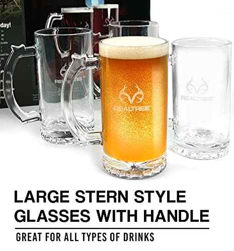 Product Details: Set of 4 Beer Mug Glasses by Realtree. Holds 16oz of liquid with a total dimension of 5.25 tall x 3 wide opening. Each glass is laser etched with the Realtree logo one of America s favorite outdoorsman brands. Realtree s signature take on a classic beer mug includes cut glass handles with the impression of antlers paying homage to the well-known Realtree Outdoorsman brand for hunting and fishing camo and sport. The antler handle also provides extra support for holding the beer glass with the weighted bottom. The 4 pack set features an extra thick base with attractive cut glass pattern that adds stability and elegance to every glass. Each glass beer mug is designed for optimal flavor and oxygen flow to bring forth the full flavors and aromas of your beverages. True beer lovers will taste the difference and enjoy the quality of Realtree s Beer Stein Mug Glass set. The brilliant crystal clear glass showcases the warm colors and bubbling carbonation and foam head for a beautiful display when sharing drinks with guests. Realtree s set of 4 Beer Stein Mug Glasses is the perfect addition to your home to enjoy with friends and family with a touch of class. Versatile enough to enjoy anytime from a nice dinner to a Sunday football game. Features: Set of 4 Glasses Realtree with Antler Logo laser etched into Glass Premium lead free glasses Thick Handles Ultra thick balanced base with glass cut bottom Holds 16 oz of liquid 5.25 tall x 3 wide base x 3 wide opening WILL BE AVAILABLE FOR SHIPPING 6/30/16 WILL BE AVAILABLE FOR SHIPPING 6/30/16.