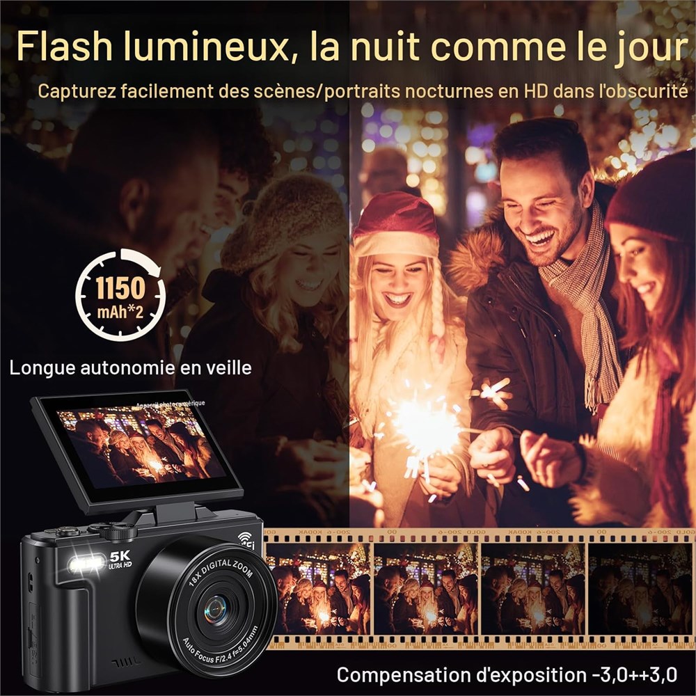 R solution 5K UHD & Appareil photo 75MP Cet appareil photo num rique capture des images poustouflantes de 75 m gapixels et tourne des vid os 5K Ultra HD vibrantes avec des couleurs riches et des d tails nets. Faites passer votre photographie au niveau sup rieur avec une vari t de filtres int gr s pour une exp rience cr ative unique. Mise au point automatique facile et zoom num rique 18x : cet appareil photo dispose d'un zoom num rique 18x robuste, vous permettant de capturer des objets loign s avec facilit . La fonction d'autofocus garantit que vos prises de vue sont toujours nettes, pour que vous puissiez capturer sans effort des moments parfaits. La cam ra vlogging dispose galement d'un cran IPS HD de 3,0 pouces qui peut pivoter 180 , ce qui la rend parfaite pour prendre des selfies sous n'importe quel angle. Fonction WIFI sans fil et webcam/Vlog La cam ra am lior e pour YouTube est dot e d'une fonction Wi-Fi sans fil int gr e, vous permettant de partager instantan ment des vid os et des photos en ligne via votre t l phone portable. Cette cam ra vlog peut galement tre utilis e comme webcam pour le streaming en direct, les appels vid o et le blogging, ce qui facilite la diffusion en continu ou la r alisation d'appels vid o sur YouTube, Facebook, Twitter ou d'autres plateformes de m dias sociaux. Batterie rechargeable et carte SD 32 Go quip de deux batteries haute capacit et d une carte SD 32 Go, vous tes pr t commencer photographier d s la sortie de la bo te. Le flash int gr vous permet de capturer ces merveilleux souvenirs m me dans des environnements faible luminosit . De plus, l'appareil photo compact est compatible avec un tr pied, ce qui le rend parfait pour stabiliser les prises de vue longues pendant les vacances et les voyages en camping. Appareil photo automatique facile utiliser Con u pour une utilisation sans effort, cet appareil photo num rique 5K est parfait pour les d butants, les enfants, les adolescents, les tudiants et les personnes g es. Les boutons intuitifs et les menus conviviaux rendent la capture des moments aussi facile que d'appuyer sur un bouton.