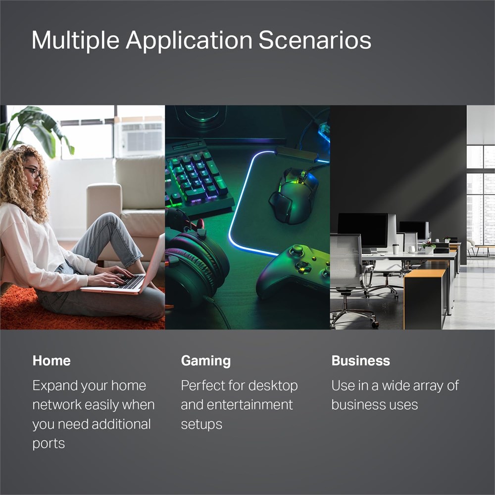 - - Equipped with 5 10/100/1000 Mbps RJ45 ports supporting Auto-Negotiation and Auto-MDI/MDIX, making network expansion simple. - - Latest innovative energy-efficient technology greatly expands your network capacity with much less power consumption, helping you save on energy costs. - IEEE 802.3X flow control provides reliable data transfer, and a fanless design ensures silent operation in any environment. - Enjoy an easy setup with no software installation or configuration needed simply plug in your devices and you are ready to go. - Prioritize your traffic and high-quality video or voice data transmission with Port-based 802.1p/DSCP QoS and IGMP Snooping. - Durable metal casing with a desktop or wall-mounting design. Operating Temperature: 0 C 40 C (32 F 104 F).
