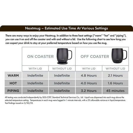 SMART MUG TECHNOLOGY Long-lasting battery & sensors maintain your ideal temperature. LED lights display battery life & real-time temperature. Includes Auto-off technology & Charging Coaster. SUPER SIMPLE On-board Control Button easily turns mug On/Off & sets the temperature. Takes only seconds to set the mug to your perfect temperature. No app required - no passwords, re-booting or security concerns. EXPERTLY CRAFTED - Elegant ceramic matte finish covers the durable, stainless-steel body of the mug. Comfortable to hold at only 17 ounces, the ergonomically designed body and handle fits perfectly in your hands. THE PERFECT GIFT - Give the gift that is certain to delight. Everyone on your list will love their hot coffee or tea drink at the perfect temperature, whether it s at home, the office or the home office. INNOVATION FROM BOULDER, COLORADO - Nextmug was designed and tested at our offices in Boulder, Colorado by a team with decades of experience making award-winning consumer products. WHAT'S INCLUDED (1) 14 oz Nextmug; (2) Docking Coaster & 6-foot cord to charge the lithium-ion battery inside the Nextmug; (3) Spill-Resistant Lid to keep hot liquids in the mug and help maintain the ideal temperature for longer periods of time.