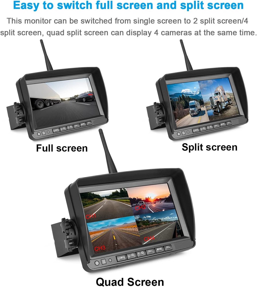 10V-32V wide voltage input, support 1/2/4 Channel wireless camera input, easy to switch full screen and split screen, wireless line of sight range up to 984 feet. 7" IPS panel digital monitor, you can see the image clearly at any angle, this monitor built-in recorder, support real time recording and video playback, maximum storage 128GB. HD 1080P digital wireless backup camera 130 wide viewing angle, built-in smart IR-CUT filter image color and more realistic, it has far better image resolution, stronger lens and longer transmission distance, which will bring you a whole new driving experience. The truck wireless rear view camera s waterproof level is IP69K rating (highest IP rating) and the vibration rating is 20G, it can work fine in all weather conditions such as pouring rain & violent storms. With 18 infra-red lights, the wireless reverse camera will be able to see up to 50ft even in complete darkness! This night vision will be even without any ambient light at all.