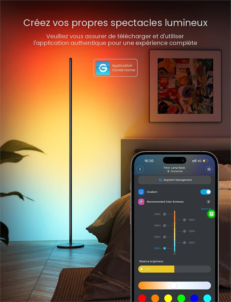 Couleur RGBIC dynamique : lib rez votre cr ativit avec la technologie Govee RGBIC, vous pouvez personnaliser chaque segment de couleur en fonction de la nature, du festival et des motions, et les bandes de notre lampadaire LED affichent des effets multicolores anim s simultan ment (les bandes ne peuvent pas tre coup es). Contr le vocal sans effort : gardez les mains libres et ne quittez jamais votre canap ou votre lit. Fonctionne avec Alexa et Google Assistant via WiFi pour contr ler sans effort ce lampadaire d'angle pour changer la luminosit , les couleurs, et plus encore. Personnalisez la lumi re exacte que vous voulez avec l'application Govee Home. Mode musique : faites la lampe sur pied qui danse avec votre musique et apportez l'exp rience de concert votre espace. En utilisant l'application Govee Home, vous pouvez synchroniser votre audio pr f r avec votre lampadaire et la lumi re pulse au rythme de la chanson. clairage personnalisable : choisissez des lampes d'angle parmi 16 millions de vari t s de couleurs et 3300 K-4300 K chaud/froid. La lampe est quip e d'une bande LED en silicone, la lumi re est douce et non blouissante. Il est fabriqu en alliage m tallique, qui est stable sans tremblement. Lumi res pour toutes les occasions : le lampadaire minimaliste moderne entoure vous et votre maison de couleurs vives. Les lampadaires RGBIC pour le salon utilisent l'application Govee Home pour choisir parmi des modes de sc ne pr d finis tels que lever du soleil et arc-en-ciel. Remarque : en raison de l'extensibilit des bandes lumineuses en silicone, veuillez d'abord fixer le bas et le haut lors de l'installation, puis fixer la partie centrale. Appuyez du milieu vers les deux c t s, ajustez au besoin pour viter l'exc s ou la p nurie.
