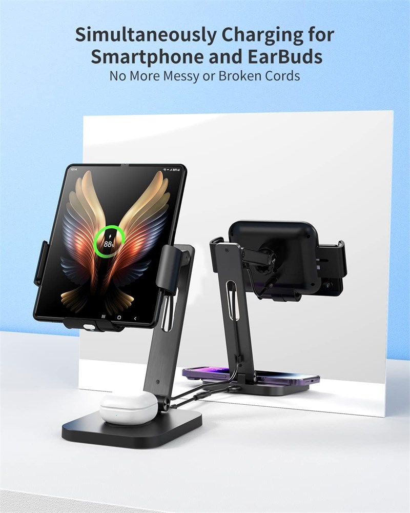 Adjustable Charging Station: Wireless charging stand for z fold phones is equipped with a 360 spherical rotating device and 3 swivel joints, so you can easily adjust to a comfortable angle under any circumstances for convenience for every viewing which helps to fix your posture and reduce back & neck strain 2 in 1 Wireless Charger for Z Fold: MAKAQI 2-in-1 charging station is specially designed for Samsung Z Fold phones and it can charge your Samsung Z Fold phones and buds simultaneously. The upper wireless phone charging station is designed with a CD pattern concept. Featuring with high-quality aluminum alloy as the stand holder of the wireless charging station, which provides a stronger support for the daily use of z fold phones Smart and Safe Charging Stand: MAKAQI wireless charger stand ensures it s safe and secure to charge your compatible devices. Built-in smart chipset provides over-current protection, over-voltage protection and over-charge protection technology to ensure your charging safety. Besides, the MAKAQI wireless charger holder for Z Fold 4 is equipped with an alloy counterweight chassis and non-slip silicone to ensure excellent stability when your device is in and protects your devices well Smart Infrared Sense & Clamping Design: MAKAQI 2-in-1 wireless charging station features the latest infrared sensing technology. The arm clamps are automatically opened when your phone is close to the wireless charger and then clamped when your phone is in. Gently touching the telescopic control switch will automatically open the arms, and a one-touch release to remove the phone easily Wide Compatibility: The 3 coils design allows the upper part of the wireless charger can charge your Samsung Galaxy Z Fold series horizontally, vertically and in the folded position. MAKAQI wireless charger is best compatible with Samsung Galaxy Z Fold 6/5/4/3/2/1 and Galaxy Buds 2/2 Pro/Pro/Live, and also widely compatible with Samsung S22/21/20/10/9/8/7, NOTE 20/10/8 series phones, iPhone 15/14/13/12/X/8 series, AirPods 3/2/AirPods Pro/AirPods Pro 2nd.