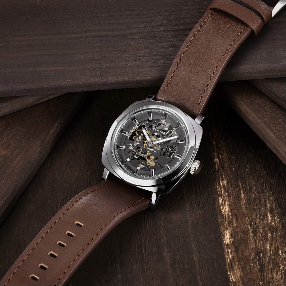 ELEGANT DESIGN: BENYAR offers a range of automatic mechanical wristwatches specially designed for men. The watch comes with thick glass and a black skeleton dial. The genuine brown leather strap with a width of 2.4 cm and a length of 22 cm gives the watch an elegant look. WATER AND SCRATCH RESISTANT: The watch withstands 30M water pressure and can endure sweat, accidental rain or splashing water. The durable bracelet is fully flexible and keeps your wrist ventilated. SUPERIOR QUALITY: The analog clock with automatic movement looks noble with the blue pointer. The case is made of high quality stainless steel. The strap is soft and comfortable to wear. Stylish and Versatile This versatile watch is suitable for any occasion, whether formal or casual. Wear this watch for on the go, for business, leisure, indoor and outdoor activities or for everyday use. The Benyar wristwatch is a good choice for you and your loved ones. BENYAR MENS WATCHES Your comfort is our number one priority. If it is a usage problem, we can help you with professional knowledge. If it's a quality issue, we can offer you a workable solution based on our experience. BENYAR will always be with you.