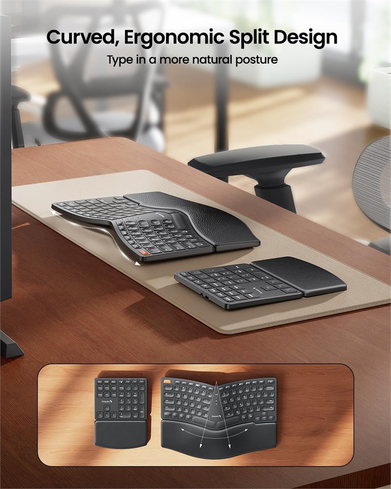 Ergonomic Comfort Design: The wireless ergonomic keyboard features with curved and split keyset design, which helps to position your wrist and forearm in a more natural and relaxed posture. Scooped scissors-switch keys perfectly match the shape of your fingertips, offering quick response with every keystroke. Maximum comfort and productivity for all-day typing. Leather Palm Rest: Curved wrist rest with leather surface offers extended typing comfort with more wrist support and less wrist bending compared to a standard keyboard without wrist rest. Two adjustable tilt legs on the bottom of the palm rest position the ergonomic keyboard at a perfect angle to keep your wrist in a relaxed and comfortable typing posture while standing. One USB for One Combo: The 2-in-1 wireless ergonomic keyboard will work as soon as you plug the USB receiver into the USB port of your computer, no additional drivers required, plug and play. 2.4GHz fast and stable connection up to 33ft, no delay or dropout. Personalize Your Setup: The separate numeric keypad provides greater flexibility for your workspace setup, greatly helps to improve your work productivity. USB-C Charging: The ergonomic keyboard is built-in rechargeable lithium battery with 250 hours of standby time after 2 hours of full charge.