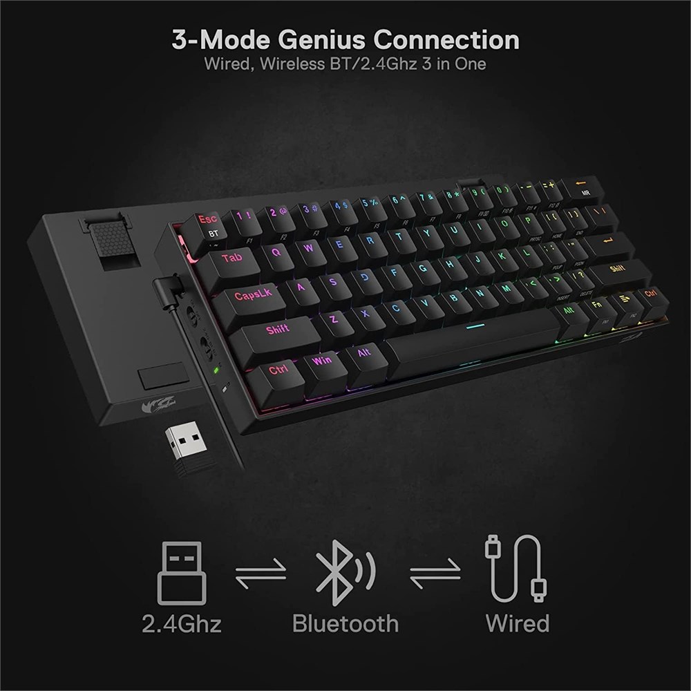 Upgraded K530 PRO - Function Upgraded YES , Price Increased NO , that is the ultimate brand-new K530 Draconic PRO. New 3 modes connection, 61 keys fully hot-swappable PCB plus original compact 60% layout. This time, you will not regret having one, the wait is over. YES! TRUE HOT-SWAP - The transformative innovation with 99.8%+ switches compatible free-mod hot swappable Redragon keyboard is available now. The unique exclusive structure design of the socket makes the switch mounting easier and less wobbling. 3-Mode Connection - Geared with Redragon innovative tri-mode connection technology, USB-C wired, BT 3.0/5.0 & 2.4Ghz wireless modes which make the user experience upgraded to another level in all fields. Wireless Made Easy - Built-in upgraded 3.0/5.0 BT and 2.4Ghz wireless chips, K530 Pro offers a real-wireless and no-latency connection for all devices. Easy to toggle among 3 different wireless devices via side switch (2.4Ghz/BT1/BT2). Hot-Swappable Red Switches - Hot-swappable with almost all switch types in the market no matter 3-pin or 5-pin. Quiet basic linear mechanical switches, soft key travel makes every click easy to register. Easy to mod or update it with your wishing preference, no forum researching required. Dedicated for FPS Gamer - Place the keyboard proper straight on your desktop and no more crooked way for mouse space saving, your mouse will never hit the keyboard any more. Enjoy waving the mouse without any worries and go get that Team Kills. RGB Illumination Builder - Dynamic 13 presets illumination modes are free to choose by the keyboard itself. Millions of color options and reactive typing effects make you the designer of your ultimate gear with a pro driver. Ultimate 60% Wireless Keyboard w/ brand new upgraded software/drive. Get the download link below the product detail description or visit Redragonshop software page (K530-PRO) to dive into the completely endless customization joy.