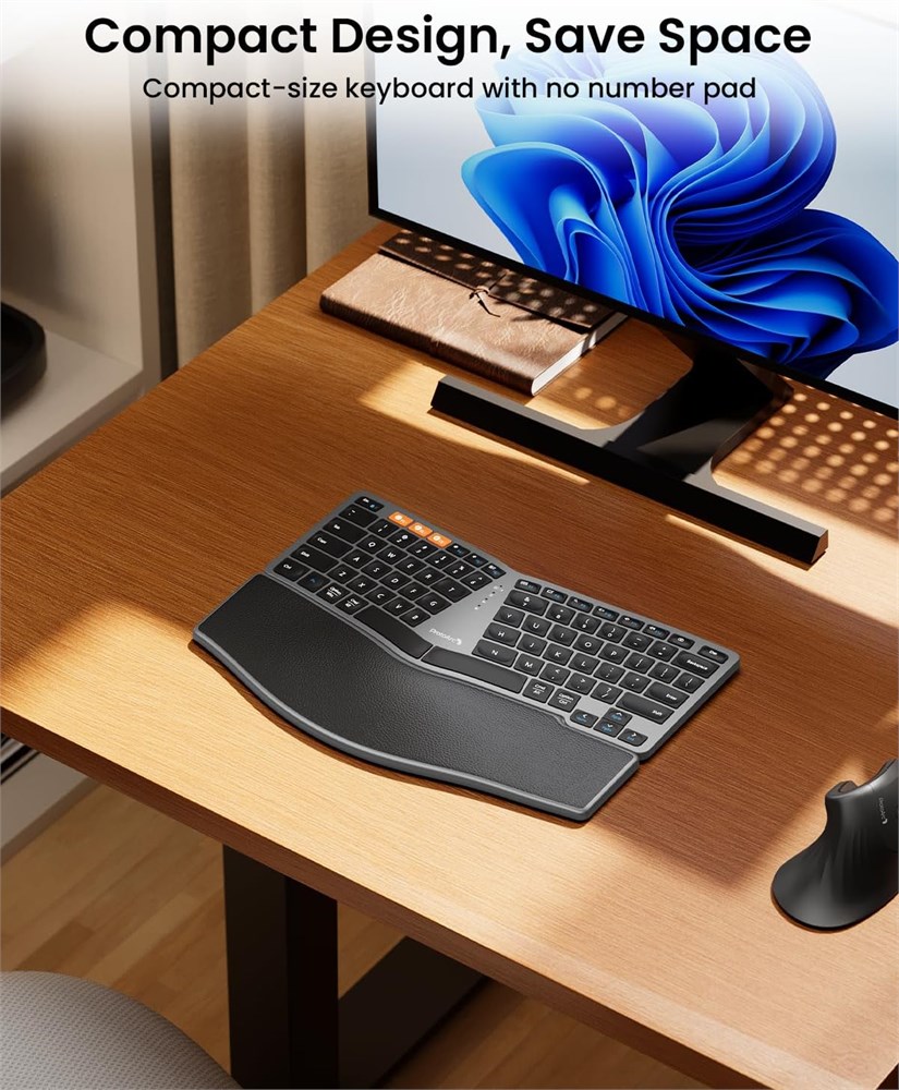 Compact Ergonomic Keyboard: Featured with curved and split keyframe, compact layout without number pad enables you to position your mouse closer to your body, promoting a more natural shoulder alignment for enhanced comfort. The compact ergonomic keyboard offers a space-saving solution to maximize workspace efficiency without sacrificing comfort and functionality. Kindly Note: The ergonomic keyboard is NOT a full-size keyboard, it doesn't have a 10-key number pad. Hard Palm Rest: Curved, hard wrist rest with leather surface offers extended typing comfort with more wrist support and durability. Kindly Note: This wrist rest is not a soft cushioned one and non-removable. Switch up to 3 Devices Seamlessly: The wireless ergonomic keyboard offers versatile connectivity options, via 2.4G USB receiver or Bluetooth, allowing you to easily switch between 3 devices with a simple button press. Compatible with Windows 7/8/10, Mac OS X 10.12, and Android 4.3 or higher. Adjustable Tilt Legs: 4 adjustable tilt legs on the bottom of the ergonomic keyboard keeps your wrist in a relaxed and comfortable typing posture while sitting or standing. USB-C Charging: The wireless ergonomic keyboard is built-in rechargeable battery with 250 hours of standby time after 2 hours of full charge. Auto sleep mode for power saving after 30 minutes of no operation. (The charging cable can only be used for charging, not for wired connection) Warm Tips: The dimensions of this compact ergonomic keyboard is 13.1inch long and 8.9inch wide. It does take more time to get used to the split layout of the ergonomic keyboard than traditional keyboard, but you will find it worth the effort.