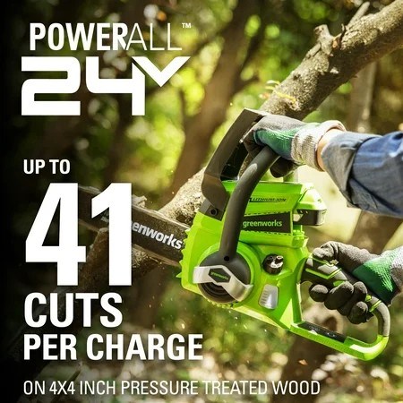 Greenworks 24V 10" Cordless Chainsaw: 24V lithium-Ion battery compatible with both indoor and outdoor tools 10" bar and chain suitable for cutting branches and limbs Tool less chain tensioning for quick adjustments so you can get back to the task at hand 2AH battery included.