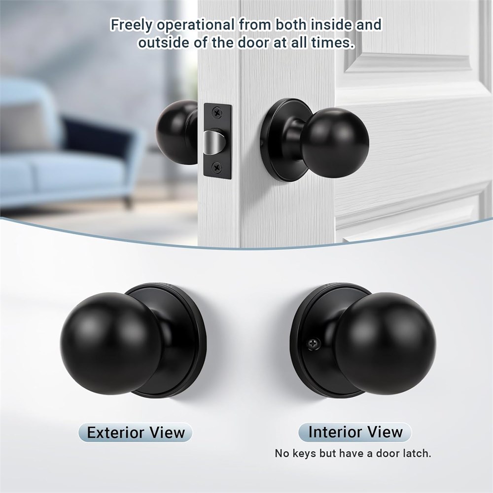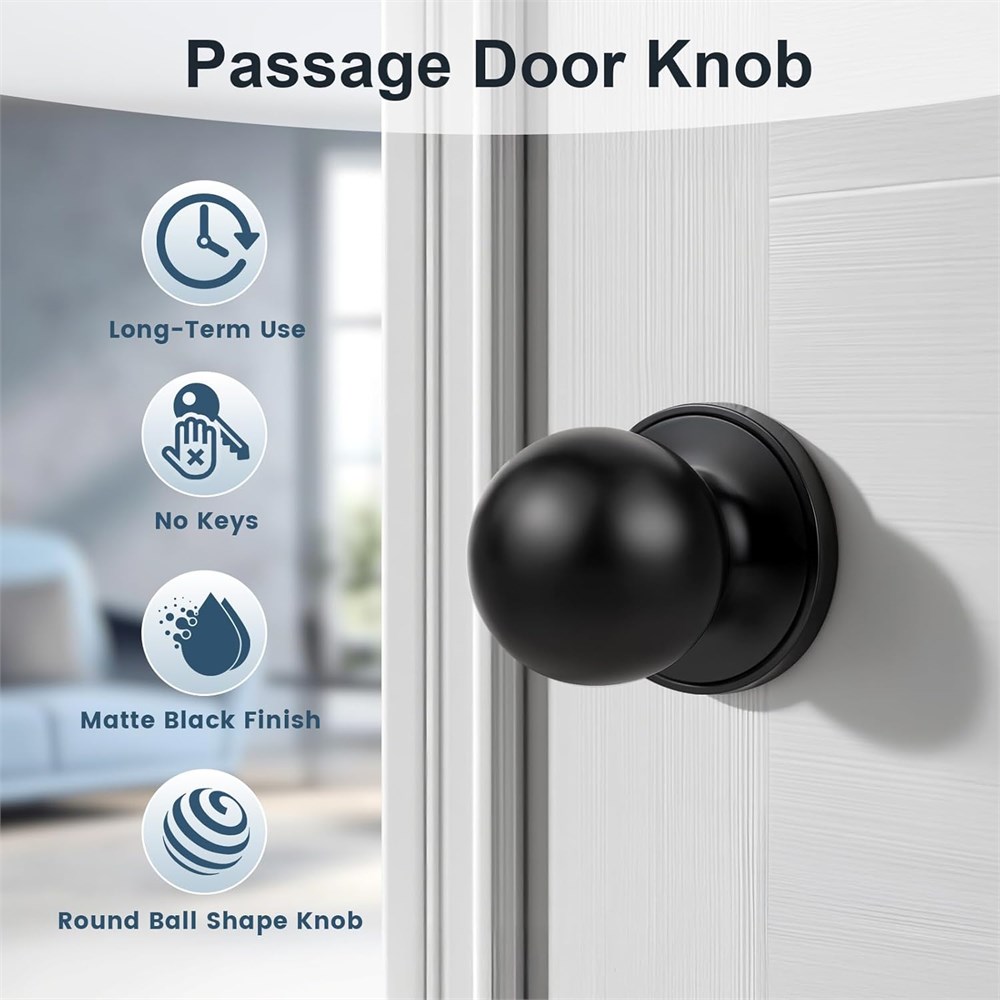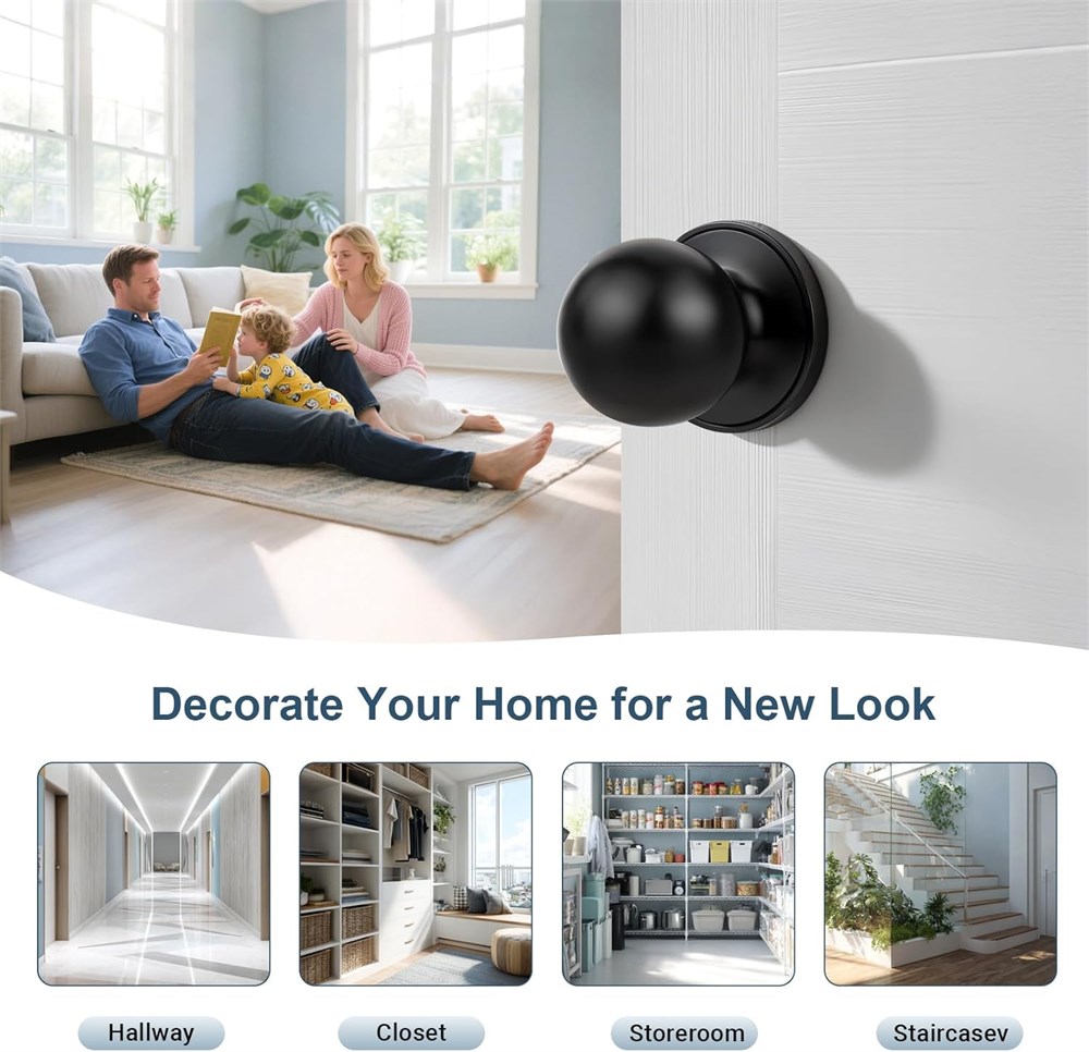 Passage Door Knob Feature: Keyless outside, no lock function, only can latch from interior/exterior doors, suitable for closet, hallway, laundry rooms where the locking function is not necessary. Material: Stainless Steel; Finished Color: Matte Black. One Size Fits Most: Adjustable Door Latch: 2-3/8" or 2-3/4" (60mm or 70mm); This black door knob fits 1-3/8" to 1-3/4"(35mm to 45mm) doors; Reversible for both left handed and right handed doors. Notice: The latch plate is unremovable. Durable Quality: The solid steel & stainless steel, smooth finish, polished appearance and substantial, easy-to-grasp door knob will subtly elevate and enhance commercial areas or residences alike. Suitable Size Round Ball Knob Design: Knob Diameter: 2.2"(57mm). Rosette Diameter: 2.56"(65mm). It s not just a door knob it s a statement piece. These gorgeous knobs with no protruding flanges, screws or rough edges ensures completely safe and easy operation, are sure to add a touch of sophistication to your home. Esay Installation: All accessories and detailed installation instructions included. Install your knob set in a flash. All you need is a door and a tool set! No need for professional door fitters, you can do it yourself! Reminder: The long screws come preinstalled in the door handle. Please remove them before installation.