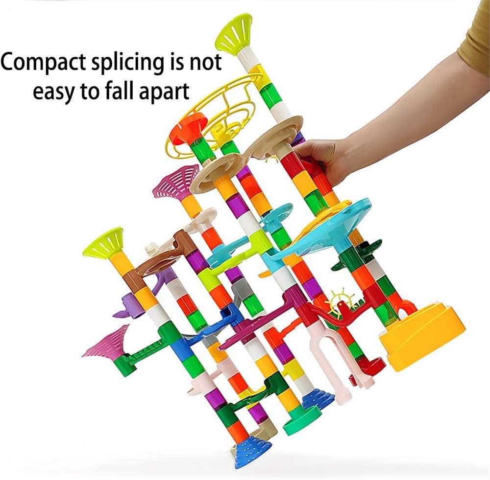 Sturdy Tight This kids STEM building blocks toys set adopts high quality ABS plastic material, pieces together tightly, standing firmly. Track interface size is scientific design, compact firm , but also easy to move. Include:Total 150pcs parts, include 50 pipeline connectors ,8 sturdy bases, 27 exciting part , 60 pieces 0.51 inch marble(15 plastic ,30 plastic glowing,15 glass) and specification. Funny Toy :Building and running the marbles through the different designs that you can make. Children will thrilled when watching the marbles roll in the exciting part and dorp .It s really educational and entertaining at the same time. Ideal Marble Building Set Gift: Perfect marble game toy choice for birthday gift, children party favor, after-school fun, Christmas presents and all other holidays.