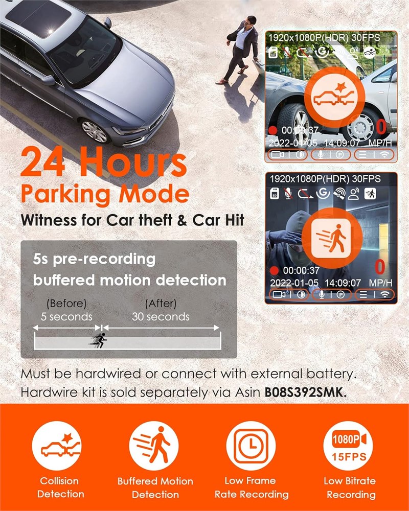 FHD 1080P Mini Dash Cam Vantrue E1 Lite mini dash camera with 160 wide angle lens clearly records the front view of your vehicle at the resolution of 1920 x 1080P@30FPS. This front dashcam will help you save key evidence such as license plate numbers and road signs in case of accident. The small and exquisite design will avoid obstructing the driving view and make driving safer. This smart dash cam is compatible with almost all cars, trucks, minivans, SUVs and caravans. Built in WiFi and GPS With built in high-frequency WiFi module and dual system GPS module. This WiFi dash cam allows you to configure dashcam s settings, preview, playback, download, edit recorded videos, share online and track GPS data including live speed in KM/H or MP/H, location and driving route on your smartphone via free Vantrue APP. Free Vantrue GPS player also supports zooming in footage to capture clearer license plate details. No monthly subscriptions or fees required. Smart Voice Control & Easy to Install and Use This smart dash camera can be easily controlled by multiple languages voice commands (English, Russian, Chinese, French and Japanese), which allows you to save video, take photo, start video, turn on/off audio, turn on /off WiFi, turn on/off screen by speaking simple voice commands. No need to remove your hands from the driving wheel, free you hands and improve your driving safety. Magnetic mount allows you to detach the camera from the mount easily without messing cables. Super Night Vision & HDR Adopted night vision light-sensitive chip and HDR technology, this dashboard camera can capture more details at low-light condition. Advanced HDR auto optimizes imaging results in bright and dark areas, clearly capturing licence plates with less glare. Brings you a worry-free driving experience even at night. 24/7 Parking Monitor Buffered Motion Detection will auto start recording 5s in advance and keep recording for 30s when any movement is detected, which will help you perfectly store a complete video. Collision Detection will auto start recording and save the video file when your parked car is crashed. Low Bitrate and Low Framerate Recording Mode will help you save the storage space by reducing the image quality. Must be hardwired ( ASIN: B08S392SMK ) or connected to an external battery. Super Capacitor & Loop Recording Instead of lithium-ion battery, this dash camera is equipped with a built-in super capacitor, which can adapt well to extreme temperature environment and has a long lifespan, making this dash cam safer and more durable. It records the video footage continuously and auto overwrites the oldest with the newest, so it won t stop recording when the SD card is full. This dashboard camera supports up to 512GB SD card. (Buy Separately, ASIN: B09SP5X2Y4)