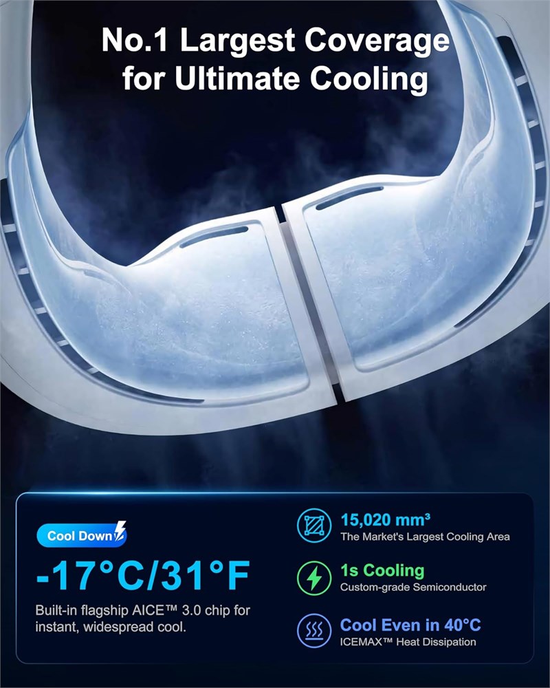 Outdoor Essential for Cooling in Over 40 C: The AICE LITE neck air conditioner utilizes patented ICEMAX cooling technology to efficiently dissipate heat and cool down hot summer days outdoors. Its exclusive superconducting aluminum cooling efficiency is 2.6 times higher than conventional aluminum, rapidly cooling the surrounding environment. With multiple heat dissipation vents, it can effectively maintain efficiency even in outdoor heat, delivering a consistent flow of frosty, refreshing air beyond what the market offers. No.1 Largest & Coolest Frozen Icyland Chilling You in Speed: AICE LITE sets the standard for powerful cooling! With the largest cooling area on the market at 15,020mm , this neck fan air conditioner effectively covers key heat zones and blood vessel pathways on your neck, swiftly delivering refreshing cool air throughout your body, banishing any stickiness. German custom-made semiconductors efficiently produce frost instantly. Join us in experiencing a revitalizing sensation this summer! From Head to Toe, Chill Rushes in: Our exclusive ice triangle circulation system tackles the challenge of conventional neck A/Cs struggling in high outdoor temperatures, enveloping your entire body in coolness! With a powerful cooling cluster and four vents dispersing cold air above and below, it swiftly transforms the surrounding breeze into a refreshing chill. Whether you're in Vancouver or Toronto, the AICE LITE neck cooler ensures your entire body stays comfortably cool on hot and humid days! Continuous Coolness: Powerful Battery, Swift Charge: Leave battery concerns behind and stay immersed in cooling all day long! The super large 6000 mAh battery is maximized by the AI battery system, ensuring an impressive battery life of 3-30 hours. With 15W fast charging, you can recharge 80% in just 2 hours, meaning a lunch break is all it takes to fully power your neck cooler again. And, it also supports pass-through charging, so pair it with a power bank and enjoy chilling all day from sunup to sundown and beyond. Personal Temperature Expert: Personalized temperature management creates a customized comfort experience, enhanced with AI mode that actively detects temperature changes and adjusts temperature and wind speed for optimal comfort. The RANVOO app offers four modes - Fan, Cooling, Heating, and AI mode - each adjustable between 16 C and 51 C, with additional options such as Silent mode, Low Power mode, Hot Pack mode, and Cooling First mode, providing you with a comprehensive range of settings for comfort needs. Ultimate Comfort with Ergonomic Design: Experience unparalleled lightweight comfort with AICE LITE's innovative internal design. Its ergonomic construction evenly distributes weight, ensuring you hardly notice it while enjoying all-day cooling relief. With silent mode and hair-pinch-proof features, AICE LITE takes comfort to new heights, keeping you focused during meditation or meetings without hair or beard interference.