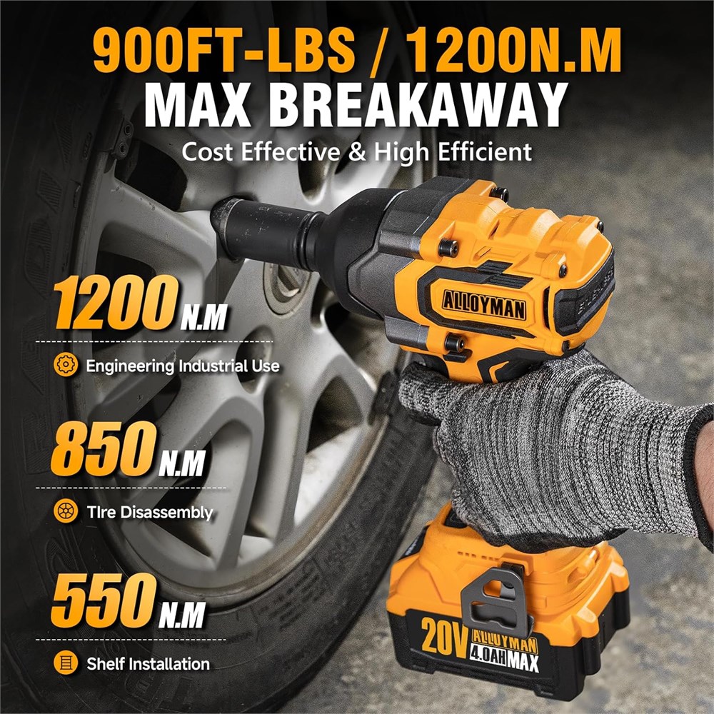 Brushless Motor -- Efficient & Quieter, and Spark-Free 900Ft-lbs (1200N.m) cordless impact wrench has a powerful and long-lasting. Compared to traditional motors, impact wrench run 50% longer, are quieter, spark-free, and are easy to use making them the tool artifact on the job. It boosts efficiency by 90% compared to manual tools, while reducing operator fatigue by 80%. Ideal for heavy work, this tool saves over 2 hours daily on industrial tasks. Industrial-Grade Professional Quality The Alloyman impact wrench combines Industrial Grade durability with revolutionary efficiency. Its 1/2" tungsten steel anvil and alloy hammer deliver 900 foot-pounds of torque to tackle stubborn bolts while withstanding over 100,000 brutal cycles (2x the lifespan of competitors). Oil-resistant TPE grips reduce fatigue by 50%. Reinforced with ABS armor (1.2m drop protection, 3x the industry standard), this indestructible powerhouse dramatically reduces annual replacement costs while dominating truck tires, rusted scaffolding, and industrial bolts. Precision meets battlefield toughness on one hand. Intelligent Protection Alloyman impact wrench smart chip proactively prevents short circuit/over-heating/over-current/over-voltage, reducing tool failures by 80%. Built-in cooling fan maintains perfect temperature during long continuous use. In reverse mode, once the nut or bolt is loosened, the brake stop device will start and reduce the speed and torque to prevent the nut from flying out, ensuring your safety on construction sites and auto shops. Precision Power Gear Level-Multiple Scene Applications Alloyman impact wrench's variable-speed trigger delivers continuously adjustable speed with 3 optimized gears: 1st (0-1700 RPM/400 N.M) for delicate work, 2nd (0-2000 RPM/650 N.M) for standard bolts, and 3rd (0-2400 RPM/1200 N.M) for stubborn nuts - Widely used in private cars, trucks, tractor tire removal/repair, agricultural machinery, large-scale construction and maintenance, furniture assembly, DIY projects, etc. to meet your daily needs, reducing tool changes by 60% and completing jobs 40% faster. Convenient to Use, Zero Hassle Insert the battery and press the speed trigger - your Alloyman impact wrench is ready to go in 1 second, no setup time required. The lock switch is 100% prevented from accidental start during transport. One-touch forward/reverse control and super bright LED work light (50% brighter than standard) let you complete car repairs faster in a dark garage and work more efficiently on a nighttime construction site. Every feature is carefully designed to save you time on every job. Double The Power, Zero Downtime The Alloyman impact wrench includes two 20V/4.0Ah batteries delivering 200% more runtime and is equipped with a charger that can be quickly charged in one to two hours, allowing you to work easily! The LED power indicator ensures perfect battery management. What You Get 1 x impact wrench, 2 x 4.0AH battery packs, 1 x fast charger, 4 x impact sockets (17mm, 19mm, 21mm, 24mm)