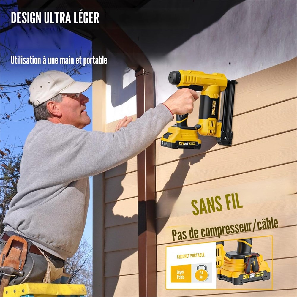Pratique sans fil : dites adieu aux compresseurs encombrants, aux tuyaux g nants et aux outils co teux cartouche de gaz avec le pistolet ongles sans fil ALLOY POWER. Le pistolet clous de calibre 18 est aliment par piles, vous donnant la flexibilit et la portabilit pour travailler n'importe o . Agrafeuse/agrafeuse lectrique sans fil 2 en 1 : le pistolet clouer/agrafeuse ALLOY POWER 2 en 1 est un outil polyvalent qui peut entra ner une gamme de clous de 18 GA (5/8"-2,5 cm-1/4") et des agrafes couronne 18GA de 6,35 mm (5/8 "-1/4") et des agrafes couronne 18GA de 6,35 mm cm - 2,5 cm. cm), parfait pour les projets de bricolage, le travail du bois, la d coration int rieure, la r paration de lattes de cl ture, les travaux de garniture, etc. Batterie de grande capacit : la batterie lithium-ion de 20 V a une grande capacit et est tr s durable, non seulement le temps de fonctionnement est prolong de 80 %, mais galement la dur e de vie de la batterie est prolong e de 60 %. Chaque charge compl te peut tirer 2000 clous, vous permettant de terminer le travail rapidement et efficacement. R glage de la performance : le design am lior de r glage de la profondeur, combin avec le bouton de r glage rotatif, vous permet de l'ajuster librement selon les besoins de votre projet de bricolage. Qu'il s'agisse de bois dur ou de plaques de pl tre souple, le pistolet ongles lectrique ALLOY POWER 18GA peut tre ajust avec pr cision en fonction de la situation r elle pour obtenir la meilleure performance de p n tration de l'ongle. S curit et commodit : vous pouvez tirer des clous ou des agrafes uniquement lorsque l' pingle de nez de s curit est enti rement press e contre la surface de travail, emp chant ainsi les tirs accidentels des ongles. En outre, il est quip d'une lumi re LED et d'un crochet de ceinture pratique pour garantir une prise de vue pr cise m me dans des conditions de faible luminosit et fournir une portabilit pour le travail. Contenu : 1 cloueuse 18 GA, 1 batterie 20 V, 1 chargeur, 500 agrafes, 1 000 clous.