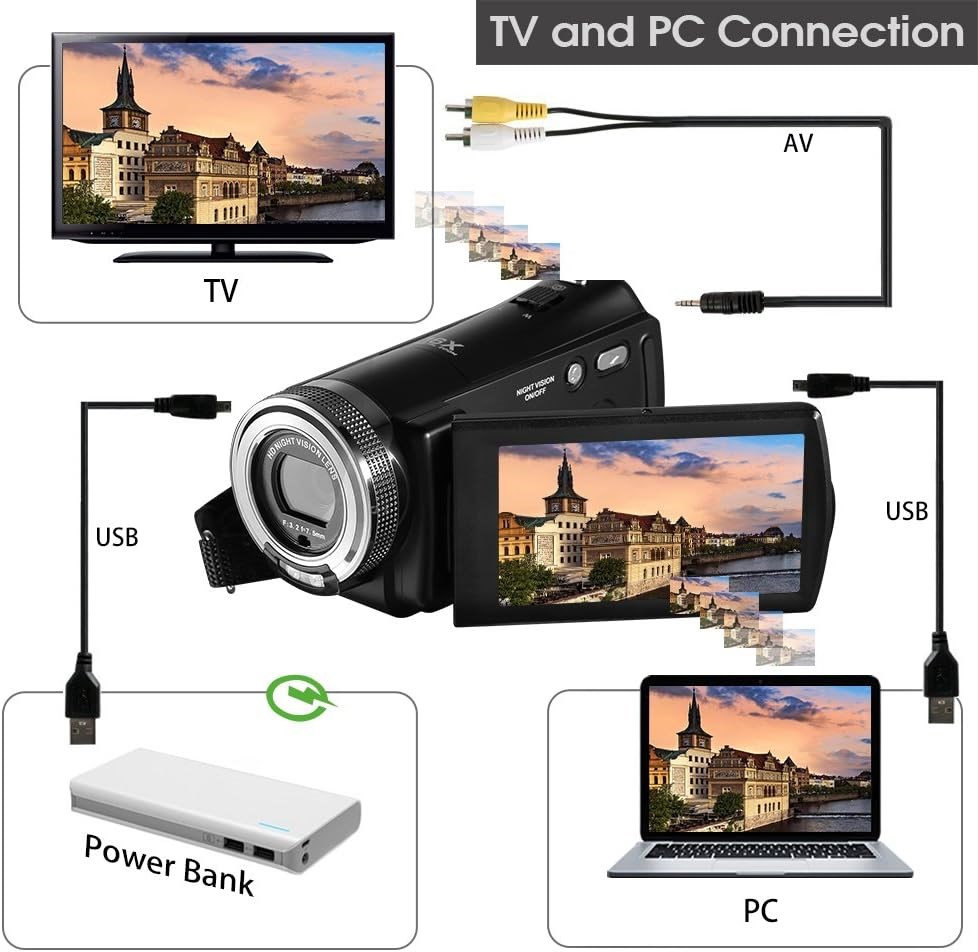 1080P Video camera: 1920x1080P (FHD) resolution, up to 20.0 mega pixels. 3.0 inches TFT-LCD screen (270 degrees rotation). 16x digital zoom, face capture, anti-shake, built-in microphone and speaker, mini USB2.0 and AV output, remote control. We recommend uploading videos to your TV or computer to show better images and sound. Light weight and compact camera: 9.35 ounces, 4.7*2.6*2.4 inches. Decent camera and very easy to use. Comes with a standard 16GB SD card (Class10), user friendly. This camcorder supports up to 32gb sd card. Insert the SD card into the camera and then install the battery. Normally shooting and recording video after formatting the SD card (Tips: This camera is a fixed zoom lens, the focus distance is 8 feet or more). Camcorder with infrared night vision: This little camera has two IR lights, it can perform nature and high definition image in completely dark environment by during on infrared night vision mode. There is a standard 1 4 threaded interface on the bottom of the camera. You can mount the camera on tripod and use the remote control to take pictures and videos. Tripod needs to be purchased separately. Up to 80 minutes of video recording: It comes with two NP-120 3.7V 1000mAh lithium batteries. After installed the battery correctly and use the mini USB cable to charge the camera up to 3 hours, it can take videos up to 80 minutes in the full HD mode. Tips: Shooting in night vision mode will be less than 80 minutes. What you get: ORDRO HDV-V12 video camera, two NP120 3.7V 1000mAh lithium batteries, USB charger, mini USB charging cable, AV cable, remote control, camera bag, user manual.