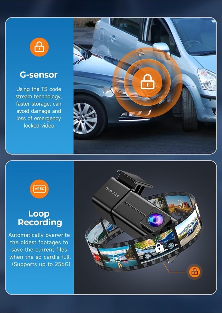 Note: This product requires a Wi-Fi connection for normal use. Please refer to the instruction manual for detailed steps. Before using the app, ensure it has local network access permissions and that any VPN on your device is turned off. CarPlay and Android Auto may interfere with the connection, so disconnect them from your phone. 2.5K Clear Recording Experience top notch video quality with the V100 dash cam. Featuring an advanced Starvis sensor and 6 glass lens, it captures your drives in stunning 2560*1440P resolution, offering 70% more pixels than standard 1080P. The 160 wide angle lens min blind spots and easily covers up to 4 lanes. With Super Night Vision technology and an F1.8 large aperture, the dashcam for cars increases light intake by 30%, ensuring clear and detailed footage even in low light conditions. Seamless Easy WiFi-APP Control Stay connected on the go with our V100 car dash cam dedicated app for both iOS and Android smartphones. Effortlessly stream live video, preview and download recordings, adjust settings, and share your footage on social media right from your phone. Ideal for cars, trucks, and SUVs, this feature of dash camera makes it easier than ever to provide evidence for insurance claims. Continuous Loop Recording & G-Sensor Never miss a moment with our continuous loop recording mini dash cam, which automatically overwrites the oldest unlocked files when your memory card is full. Equipped with a smart G-Sensor, the front dash cam instantly detects any sudden vibrations or shocks, locking the relevant video clips to ensure they aren t overwritten. It ensures that crucial footage is always preserved. Generous Storage V100 dash cam front comes with a pre-installed 32GB SD card, ready to use right out of the box. It supports up to 256GB of memory. Please ensure you are using a high-quality U3 or higher-grade Micro SD card, as recommended in our product details. Using an incompatible card may lead to issues with recording and playback. Refer to the user manual for detailed specifications and recommendations. 24/7 Parking Mode & Time Lapse Keep your car under constant surveillance with our 24-hour parking mode, which requires a Hardwire Kit (ASIN: B0D9NJHBYW, NOT Included). Our V100 dash cam front automatically switches to parking mode when your car is parked, ensuring round-the-clock protection. The 24-hour time-lapse car camera feature records continuously at a low frame rate and low power consumption, safeguarding your vehicle from theft or vandalism.